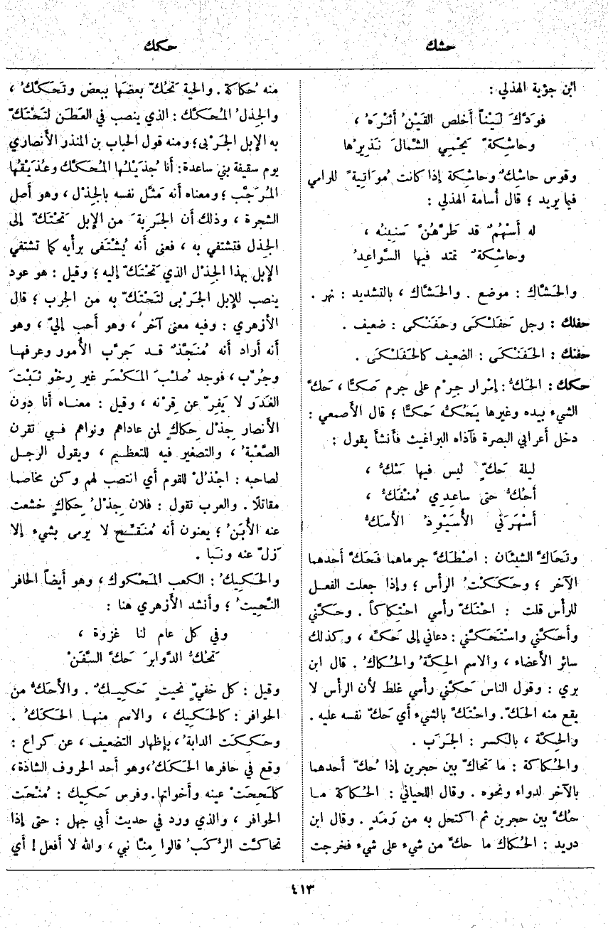 حكك: الحَكُّ: إِمْرار جِرْم عَلَى جِرْمٍ صَكّاً، حَكَّ الشَّيْءَ بِيَدِهِ وَغَيْرِهَا يَحُكُّه حَكّاً؛ قَالَ الأَصمعي: دَخَلَ أَعرابي الْبَصْرَةَ فَآذَاهُ الْبَرَاغِيثُ فأَنشأَ يَقُولُ: