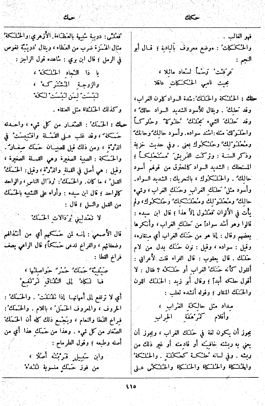 حلك: الحُلْكة والحَلَكُ: شِدَّةُ السَّوَادِ كَلَوْنِ الْغُرَابِ، وَقَدْ حَلِكَ. وَيُقَالُ للأَسود الشَّدِيدِ السَّوَادِ حالكٌ، وَقَدْ حَلَكَ الشَّيْءُ يَحْلُكُ حُلُوكةً وحلُوكاً واحْلَوْلكَ مِثْلَهُ: اشْتد سَوَادُهُ. وأَسود حالِكٌ وحانكٌ ومُحْلَوْلِكٌ وحُلْكُوك بِمَعْنًى. وَفِي حَدِيثِ