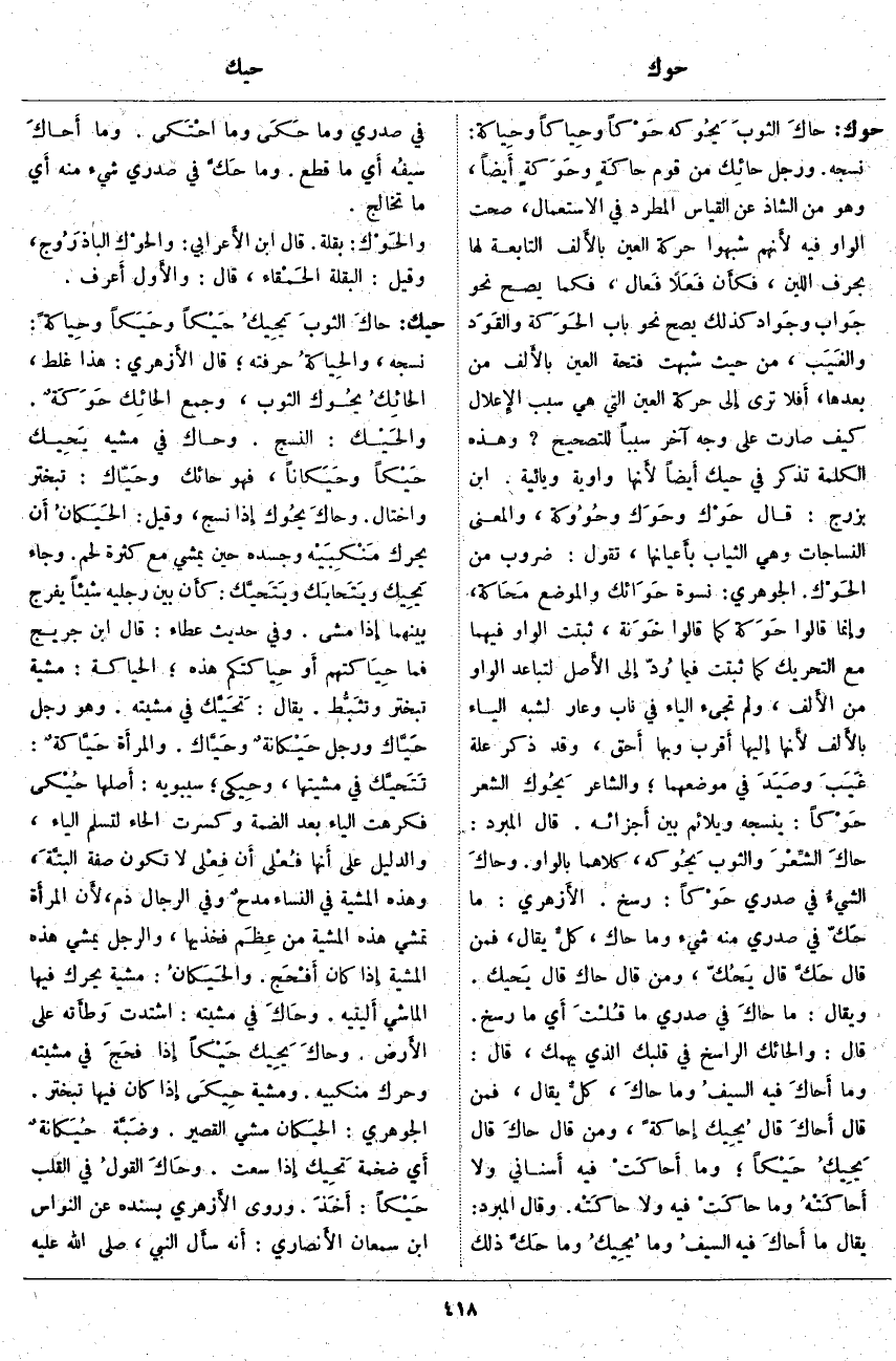 حوك: حاكَ الثوبَ يحُوكه حَوْكاً وحِياكاً وحِياكة: نَسَجَهُ. وَرَجُلٌ حائِك مِنْ قَوْمٍ حاكَةٍ وحَوَكةٍ أَيضاً، وَهُوَ مِنَ الشَّاذِّ عَنِ الْقِيَاسِ الْمُطَّرِدِ فِي الِاسْتِعْمَالِ، صَحَّتِ الْوَاوُ فِيهِ لأَنهم شَبَّهُوا حَرَكَةَ الْعَيْنِ بالأَلف التَّابِعَةِ لَهَا بِحَرْفِ اللِّينِ، فَكَأَنَّ فَعَلًا فَعال، فَكَمَا يَصِحُّ نَحْوُ جَواب وجَواد كَذَلِكَ يَصِحُّ نَحْوُ بَابِ الحَوَكة والقَودَ والغَيَب، مِنْ حَيْثُ شُبِّهَتْ فَتْحَةُ الْعَيْنِ بالأَلف مِنْ بَعْدِهَا، أَفلا تَرَى إِلَى حَرَكَةِ الْعَيْنِ الَّتِي هِيَ سَبَبُ الإِعلال كَيْفَ صَارَتْ عَلَى وَجْهٍ آخَرَ سَبَبًا لِلتَّصْحِيحِ؟ وَهَذِهِ الْكَلِمَةُ تُذْكَرُ فِي حَيَكَ أَيضاً لأَنها وَاوِيَّةٌ وَيَائِيَّةٌ. ابْنُ بَزُرْجَ: قَالَ حَوْك وحَوَك وحُوُوكة، والمعنى النسجات وَهِيَ الثِّيَابُ بأَعيانها، تَقُولُ: ضُرُوبٌ مِنَ الحَوْك. الْجَوْهَرِيُّ: نِسْوَةٌ حَوَائك وَالْمَوْضِعُ مَحَاكة، وَإِنَّمَا قَالُوا حَوَكة كَمَا قَالُوا خَوَنة، ثَبَتَتِ الْوَاوُ فِيهِمَا مَعَ التَّحْرِيكِ كَمَا ثَبَتَتْ فِيمَا رُدّ إِلَى الأَصل لِتَبَاعُدِ الْوَاوِ مِنَ الأَلف، وَلَمْ تَجِئِ الْيَاءُ فِي نَابٍ وَعَارٍ لِشِبْهِ الْيَاءِ بالأَلف لأَنها إِلَيْهَا أَقرب وَبِهَا أَحق، وَقَدْ ذَكَرَ عِلَّةَ غَيَبَ وصَيَدَ فِي مَوْضِعِهِمَا؛ وَالشَّاعِرُ يَحُوك الشِّعْرَ حَوْكاً: يَنْسِجُهُ وَيُلَائِمُ بَيْنَ أَجزائه. قَالَ الْمُبَرِّدُ: حاكَ الشِّعْرَ والثوبَ يَحُوكه، كِلَاهُمَا بِالْوَاوِ. وحاكَ الشيءُ فِي صَدْرِي حَوْكاً: رَسَخَ. الأَزهري: مَا حَكّ فِي صَدْرِي مِنْهُ شَيْءٌ وَمَا حَاكَ، كلُّ يُقَالُ، فَمَنْ قَالَ حَكّ قَالَ يَحُكّ، وَمَنْ قَالَ حَاكَ قَالَ يَحيك. وَيُقَالُ: مَا حاكَ فِي صَدْرِي مَا قُلْتَ أَي مَا رَسَخَ. قَالَ: وَالْحَائِكُ الرَّاسِخُ فِي قَلْبِكَ الَّذِي يَهُمُّكَ، قَالَ: وَمَا أَحاكَ فِيهِ السيفُ وَمَا حاكَ، كلٌّ يُقَالُ، فَمَنْ قَالَ أَحاكَ قَالَ يُحِيك إِحاكَةً وَمَنْ قَالَ حاكَ قَالَ يَحِيك حَيْكاً وَمَا أَحاكَتْ فِيهِ أَسناني وَلَا أَحاكَتْهُ وَمَا حاكَتْ فِيهِ وَلَا حاكَتْه. وَقَالَ الْمُبَرِّدُ: يُقَالُ مَا أَحاكَ فِيهِ السيفُ وَمَا يُحِيكُ وَمَا حَكَّ ذَلِكَ فِي صَدْرِي وَمَا حَكَى وَمَا احْتَكى. وَمَا أَحاكَ سيفُه أَي مَا قَطَعَ. وَمَا حَكَّ فِي صَدْرِي شَيْءٌ مِنْهُ أَي مَا تَخَالَجَ. والحَوْك: بَقْلَةٌ. قَالَ ابْنُ الأَعرابي: والحوْك الباذَرُوج، وَقِيلَ: الْبَقْلَةُ الحَمْقاء، قَالَ: والأَول أَعرف.