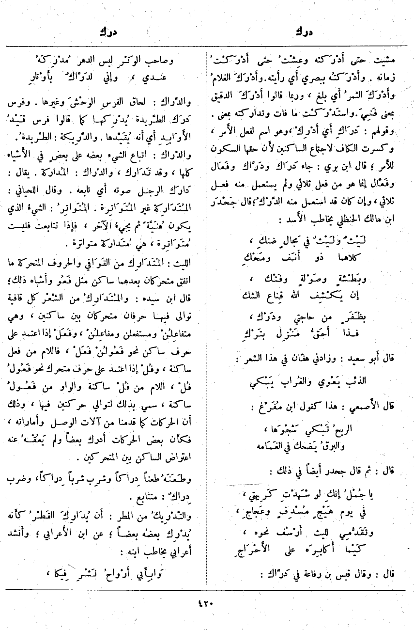والدِّراك: لَحَاقُ الفرسِ الوحْشَ وَغَيْرَهَا. وَفَرَسٌ دَرَك الطَّريدة يُدْرِكها كَمَا قَالُوا فَرَسٌ قَيْدُ الأَوَابِدِ أَي أَنه يُقَيِّدها. والدَّرِيكة: الطَّريدةُ. والدِّراك: اتِّبَاعُ الشَّيْءِ بَعْضُهُ عَلَى بعضٍ فِي الأَشياء كُلِّهَا، وَقَدْ تَدَارك، والدِّراك: المُداركة. يُقَالُ: دَارَك الرَّجُلَ صَوْتُهُ أَي تَابَعَهُ. وَقَالَ اللِّحْيَانِيُّ: المُتَدَارِكة غير المُتَوَاتِرة. المُتَواتِرُ: الشيءُ الَّذِي يَكُونُ هُنَيَّةً ثُمَّ يجيءُ الْآخَرُ، فَإِذَا تَتَابَعَتْ فَلَيْسَتْ مُتَوَاتِرة، هِيَ مُتَداركة مُتَوَاتِرَةٌ. اللَّيْثُ: المُتَدَارِك مِنَ القَوَافي وَالْحُرُوفِ الْمُتَحَرِّكَةِ مَا اتَّفَقَ مُتَحَرِّكَانِ بَعْدَهُمَا سَاكِنٌ مِثْلُ فَعُو وأَشباه ذَلِكَ؛ قَالَ ابْنُ سِيدَهْ: والمُتَدَارِكُ مِنَ الشِّعْر كُلُّ قَافِيَةٍ تَوَالَى فِيهَا حَرْفَانِ مُتَحَرِّكَانِ بَيْنَ سَاكِنَيْنِ، وَهِيَ متفاعِلُنْ وَمُسْتَفْعِلُنْ ومفاعِلُنْ، وفَعَلْ إِذا اعْتَمَدَ عَلَى حَرْفٍ سَاكِنٍ نَحْوَ فَعُولُنْ فَعَلْ، فَاللَّامُ مِنْ فَعَلْ سَاكِنَةٌ، وفُلْ إِذا اعْتَمَدَ عَلَى حَرْفٍ مُتَحَرِّكٍ نَحْوَ فَعُولُ فُلْ، اللَّامُ مِنْ فُلْ سَاكِنَةٌ وَالْوَاوُ مِنْ فَعُولُ سَاكِنَةٌ، سُمِّيَ بِذَلِكَ لِتَوَالِي حَرَكَتَيْنِ فِيهَا، وَذَلِكَ أَن الْحَرَكَاتِ كَمَا قَدَّمْنَا مِنْ آلَاتِ الْوَصْلِ وأَماراته، فكأنَّ بَعْضَ الْحَرَكَاتِ أَدرك بَعْضًا وَلَمْ يَعُقْه عَنْهُ اعْتِرَاضُ السَّاكِنِ بَيْنَ الْمُتَحَرِّكَيْنِ. وطَعَنَهُ طَعْنًا دِراكاً وشرِب شُرْبًا دِراكاً، وَضَرْبٌ دِراكٌ: مُتَتَابِعٌ. والتَّدْرِيكُ: مِنَ الْمَطَرِ: أَن يُدَارِكَ القَطْرُ كَأَنَّهُ يُدْرِك بعضُه بَعْضًا؛ عَنِ ابْنِ الأَعرابي؛ وأَنشد أَعرابي يُخَاطِبُ ابنه: