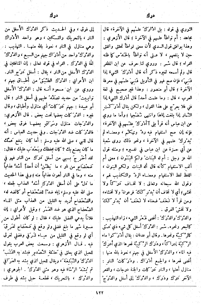 ؛ قَالَ أَبو عُبَيْدَةَ: جَهَنَّمُ دَرَكاتٌ أَي مَنَازِلُ وأَطباق، وَقَالَ غَيْرُهُ: الدَّرَكات بَعْضُهَا تَحْتَ بَعْضٍ قَالَ الأَزهري: والدَّرَجات مَنَازِلُ ومَرَاقٍ بَعْضُهَا فَوْقَ بَعْضٍ، فالدَّرَكات ضِدُّ الدَّرَجات. وَفِي حَدِيثِ