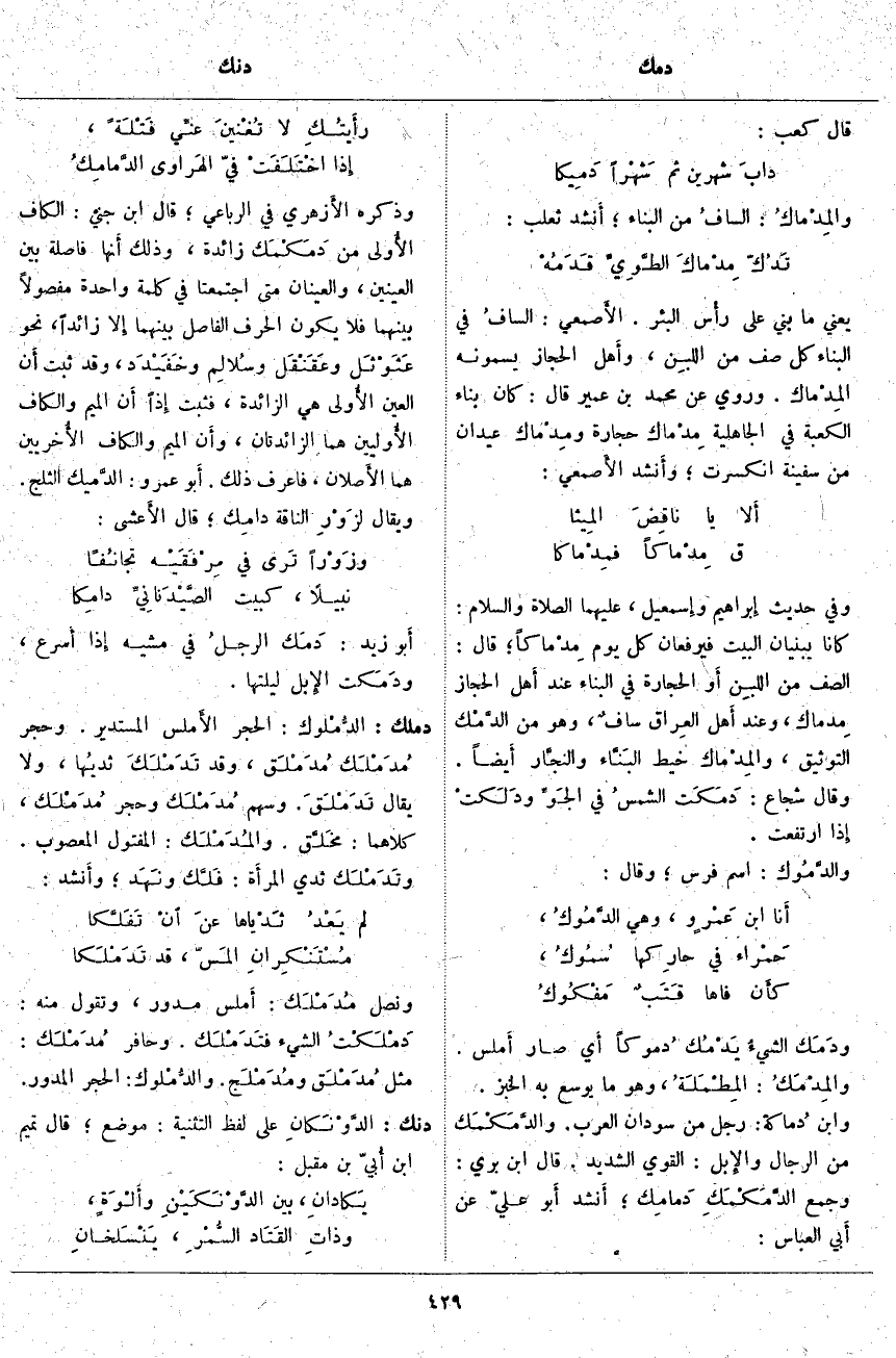 ؛ قَالَ: الصَّفُّ مِنَ اللبنِ أَو الْحِجَارَةِ فِي الْبِنَاءِ عِنْدَ أَهل الْحِجَازِ مِدماك، وَعِنْدَ أَهل العِراق سافٌ، وَهُوَ مِنَ الدَّمْك التَّوْثِيقُ، والمِدْماك خَيْطُ البَنَّاء والنجَّار أَيضاً. وَقَالَ شُجَاعٌ: دَمَكَت الشمسُ فِي الجَوِّ ودَلَكتْ إِذا ارْتَفَعَتْ. والدَّمُوك: اسْمُ فَرَسٍ؛ وَقَالَ: