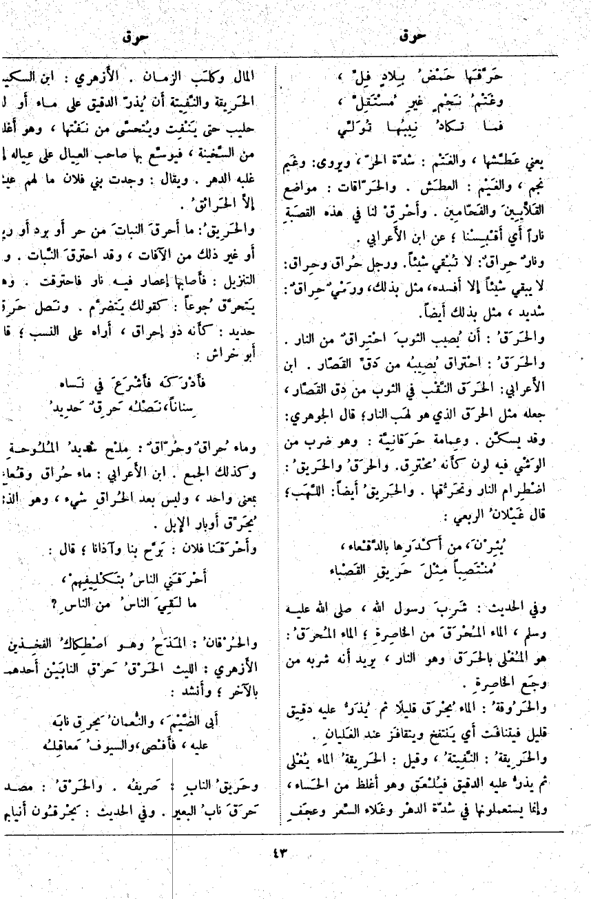 ؛ الْمَاءُ المُحرَقُ: هُوَ المُغْلى بالحَرَق وَهُوَ النَّارُ، يُرِيدُ أَنَّهُ شَرِبَهُ مِنْ وجَع الخاصِرةِ. والحَرُوقةُ: الْمَاءُ يُحْرَق قَلِيلًا ثُمَّ يُذَرُّ عَلَيْهِ دقِيق قَلِيلٌ فيتنافَت أَيْ يَنتفخ ويتقافَز عِنْدَ الغَليانِ. والحَرِيقةُ: النَّفِيتةُ، وَقِيلَ: الحَرِيقةُ الْمَاءُ يُغْلى ثُمَّ يذرُّ عَلَيْهِ الدَّقِيقُ فيُلْعَق وَهُوَ أَغْلَظُ مِنَ الحَساء، وَإِنَّمَا يَسْتَعْمِلُونَهَا فِي شِدَّةِ الدهْر وغَلاء السِّعر وعجَفِ الْمَالِ وكلَب الزَّمَانِ. الأَزهري: ابْنُ السِّكِّيتِ الحَرِيقة والنَّفِيتة أَن يُذرّ الدَّقِيقُ عَلَى مَاءٍ أَو لَبَنٍ حَلِيبٍ حَتَّى يَنْفِت ويُتحسَّى مِنْ نَفْتها، وَهُوَ أَغلظ مِنَ السَّخينة، فَيُوَسِّعَ بِهَا صَاحِبُ العِيال عَلَى عِياله إِذَا غَلَبَهُ الدَّهْرُ. وَيُقَالُ: وَجَدْتُ بَنِي فُلَانٍ مَا لَهُمْ عَيْشٌ إلَّا الحَرائقُ. والحَرِيقُ: مَا أَحرقَ النباتَ مِنْ حَرٍّ أَو بَرْدٍ أَو رِيحٍ أَوْ غَيْرِ ذَلِكَ مِنَ الْآفَاتِ، وَقَدِ احترقَ النَّبات. وَفِي التَّنْزِيلِ: فَأَصابَها إِعْصارٌ فِيهِ نارٌ فَاحْتَرَقَتْ.