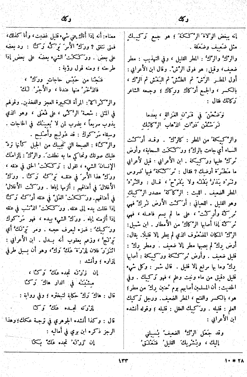 ؛ هُوَ، بِالْكَسْرِ وَالْفَتْحِ، الْمَطَرُ الضَّعِيفُ. وَرَجُلٌ رَكيك الْعِلْمِ: قَلِيلُهُ. ورَكيك الْعَقْلِ: قَلِيلُهُ؛ وَقَوْلُهُ أَنْشَدَهُ ابْنُ الأَعرابي: