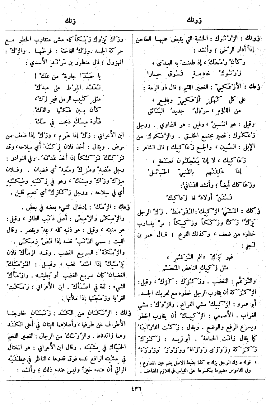 زنك: الزَّنَكتانِ مِنَ الكَتَد: زَنَمَتَانِ خَارِجَتَا الأَطراف عَنْ طَرَفِهَا، وأَصلاهما ثَابِتَانِ فِي أَعلى الكَتَد وَهُمَا زَائِدَتَاهَا. والزَّوَنَّكُ مِنَ الرِّجَالِ: الْقَصِيرُ اللَّحِيمُ الحَيَّاك فِي مِشْيَته. وَقَالَ ابْنُ الأَعرابي: هُوَ الْمُخْتَالُ فِي مِشْيته الرَّافِعُ نَفْسَهُ فَوْقَ قَدْرِهَا، النَّاظِرُ فِي عِطْفَيْه الرَّائِي أَنَّ عِنْدَهُ خَيْرًا وَلَيْسَ عِنْدَهُ ذلك؛ وأَنشد:
