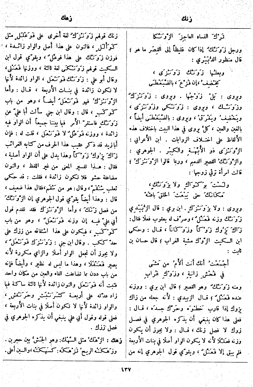 وَمِنْهُ زَوَنَّكٌ وَهُوَ الْقَصِيرُ؛ قَالَ ابْنُ بَرِّيٍّ: وَوَزْنُهُ عِنْدَهُ فَعَنَّلٌ؛ قَالَ الزُّبَيْدِيُّ: لأَنه جَعَلَهُ مِنْ زَاكَ يَزُوكُ إِذَا قَارَبَ خَطْوَه وحَرَّك جسدَه، قَالَ: فَعَلَى هَذَا كَانَ يَنْبَغِي أَنْ يَذْكُرَهُ الْجَوْهَرِيُّ فِي فَصْلِ زَوَكَ لَا فَصْلِ زَنَكَ، قَالَ: وَلَا يَجُوزُ أَنْ يَكُونَ وَزْنُهُ فعَلَّلًا لأَنه لَا يَكُونُ الْوَاوُ أَصلًا فِي بَنَاتِ الأَربعة فَلَمْ يَبْقَ إِلَّا فَعَنَّلٌ، وَيُقَوِّي قَوْلَ الْجَوْهَرِيِّ إِنَّهُ مِنْ زَنَكَ قَوْلُهُمْ زَوَنْزَكٌ لُغَةٌ أُخْرَى عَلَى فَوَعْلَلٍ مِثْلَ كَوَألَلٍ، فَالنُّونُ عَلَى هَذَا أَصل وَالْوَاوُ زَائِدَةٌ، فَوَزْنُ زَوَنَّك عَلَى هَذَا فوعَّلٌ، وَيُقَوِّي قَوْلَ ابْنِ السِّكِّيتِ قَوْلُهُمْ زَوَنْكَى لُغَةٌ ثَالِثَةٌ، وَوَزْنُهَا فَعَنْلى، وَقَالَ أَبو عَلِيٍّ: زَوَنَّك فَوَنْعَل، الْوَاوُ زَائِدَةٌ لأَنها لَا تكون زائدة فِي بَنَاتِ الأَربعة، قَالَ: وأَما الزَّوَنْزَكُ فَهُوَ فَوَنْعَلٌ أَيضاً، وَهُوَ مِنْ بَابِ كوكَبٍ، قَالَ: وَقَالَ ابْنُ جِنِّي سَأَلْتُ أَبَا عَلِيٍّ عَنْ زَوَنَّكٍ فَاسْتَقَرَّ الأَمر فِيمَا بَيْنَنَا جَمِيعًا أَنَّ الْوَاوَ فِيهِ زَائِدَةٌ، وَوَزْنُهُ فَوَعَّلٌ لَا فَوَنْعَل، قُلْتُ لَهُ: فَإِنَّ أَبا زَيْدٍ قَدْ ذَكَرَ عَقِيبَ هَذَا الْحَرْفِ مِنْ كِتَابِهِ الْغَرَائِبِ زَاكَ يزُوكُ زَوْكاً وَهَذَا يَدُلُّ عَلَى أَنَّ الْوَاوَ أَصلية، فَقَالَ: هَذَا تَفْسِيرُ الْمَعْنَى مِنْ غَيْرِ اللَّفْظِ، وَالنُّونُ مُضَاعَفَةُ حَشْوٍ فَلَا تَكُونُ زَائِدَةً، فَقُلْتُ: قَدْ حَكَى ثَعْلَبٌ شِنْقَمّ، وَقَالَ: هُوَ مِنْ شَقَم، فَقَالَ هَذَا ضَعِيفٌ، قَالَ: وَهَذَا أَيْضًا يُقَوِّي قَوْلَ الْجَوْهَرِيِّ إِنَّ الزَّوَنَّكَ مِنْ فَصْلِ زَنَكَ، وَأَمَّا الزَّوَنْزك فَقَدْ تَقَدَّمَ قَوْلُ أَبِي عَلِيٍّ فِيهِ إِنَّ وَزْنَهُ فَوَنْعَلٌ، وَهُوَ مِنْ بَابِ كَوْكَبٍ، فَيَكُونُ عَلَى هَذَا اشْتِقَاقُهُ من ززك عَلَى حَدِّ كَكَبَ. وَقَالَ ابْنُ جِنِّي: زَوَنْزَك فَوَنْعَلٌ، وَلَا يَجُوزُ أَنْ تُجْعَلَ الْوَاوُ أَصْلًا وَالزَّايُ مُكَرَّرَةً لأَنه يَصِيرُ فَعَنْفَلًا، وَهَذَا مَا لَيْسَ لَهُ نَظِيرٌ، وَأَيْضًا فَإِنَّهُ مِنْ بَابِ دَدَنَ مِمَّا تَضَاعَفَتِ الْفَاءُ وَالْعَيْنُ مِنْ مَكَانٍ وَاحِدٍ فَثَبَتَ أَنَّهُ فَوَنْعَل وَالنُّونُ زَائِدَةٌ لأَنها ثَالِثَةٌ سَاكِنَةٌ فِيمَا زَادَ عُدَّتُهُ عَلَى أَرْبَعَةٍ كَشَرنْبَثٍ وحَرَنْفشٍ، وَالْوَاوُ زَائِدَةٌ لأَنها لَا تَكُونُ أَصْلًا فِي بنات الأَربعة، فعلى قوله وقول أَبِي عَلِيٍّ يَنْبَغِي أَنْ يَذْكُرَهُ الْجَوْهَرِيُّ فِي فَصْلِ ززك.
