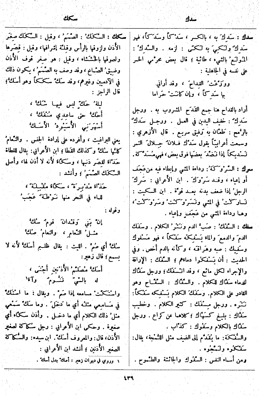 سكك: السَّكَكُ: الصَّمَمُ، وَقِيلَ: السَّكَك صِغَر الأُذن وَلُزُوقُهَا بالرأْس وقِلَة إِشْرَافِهَا، وَقِيلَ: قِصَرها وَلُصُوقُهَا بالخُشَشاء، وَقِيلَ: هُوَ صِغر قُوفِ الأُذن وضيقُ الصِّماخ، وَقَدْ وُصِفَ بِهِ الصَّمَمُ، يَكُونُ ذَلِكَ فِي الْآدَمِيِّينَ وَغَيْرِهِمْ، وَقَدْ سَكَّ سَكَكاً وَهُوَ أَسَكُّ؛ قَالَ الرَّاجِزُ: