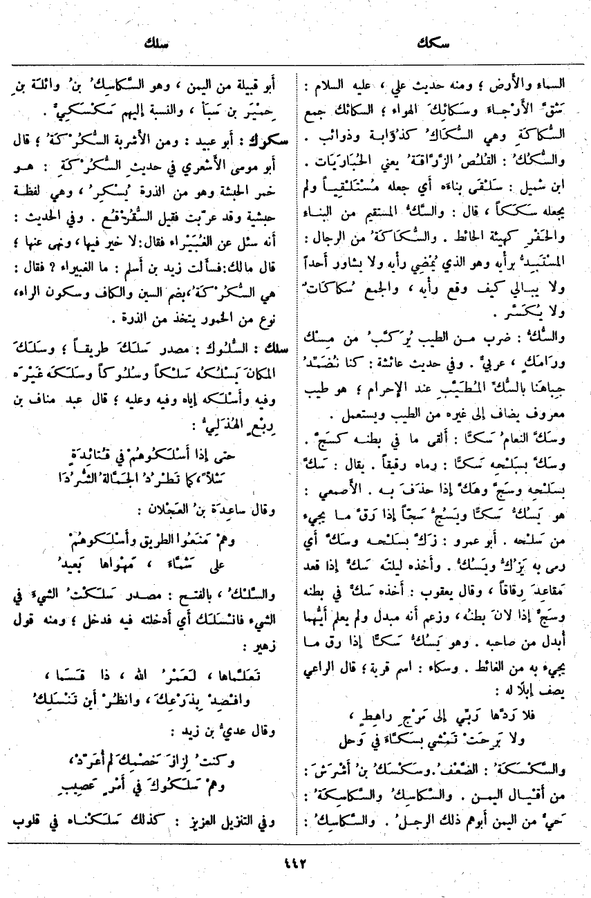 سلك: السُّلُوك: مَصْدَرُ سَلَكَ طَرِيقًا؛ وسَلَكَ المكانَ يَسْلُكُه سَلْكاً وسُلُوكاً وسَلَكَه غَيْرَه وَفِيهِ وأَسْلكه إِيَّاهُ وَفِيهِ وَعَلَيْهِ؛ قَالَ عَبْدُ مَنَافِ بْنُ رِبْعٍ الهُذَلِيُّ: