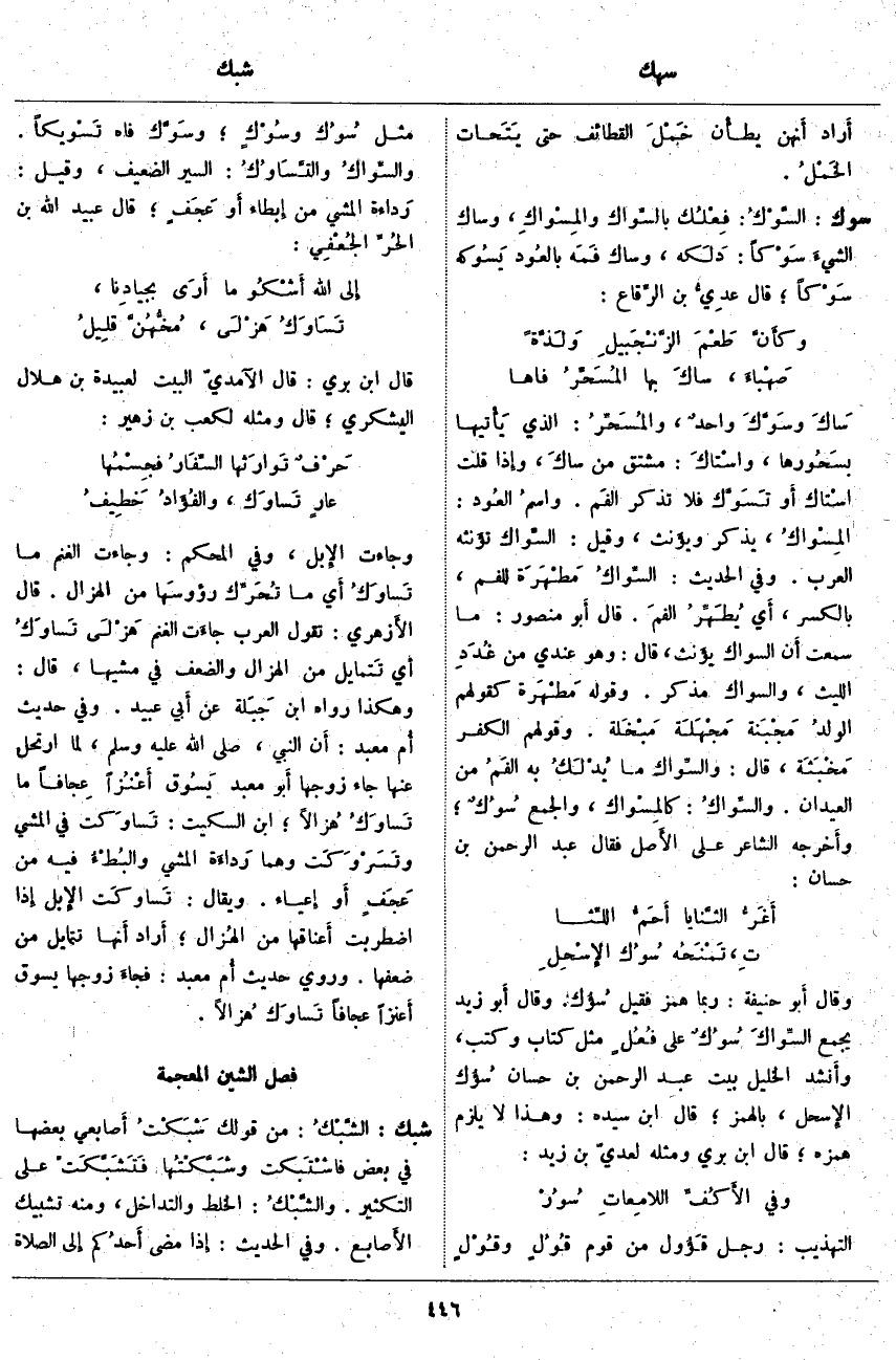وَقَالَ أَبو حَنِيفَةَ: رُبَّمَا هُمِزَ فَقِيلَ سُؤك. وَقَالَ أَبُو زيد يجمع السِّواكَ سُوُكٌ عَلَى فُعُلٍ مِثْلِ كِتَابٍ وَكُتُبٍ، وأَنشد الْخَلِيلُ بَيْتَ عَبْدُ الرَّحْمَنِ بْنُ حَسَّانَ سُؤك الإِسحل، بِالْهَمْزِ؛ قَالَ ابْنُ سِيدَهْ: وَهَذَا لَا يَلْزَمُ هَمْزَهُ؛ قَالَ ابْنُ بَرِّيٍّ وَمِثْلُهُ لِعَدِيِّ بْنِ زَيْدٍ: