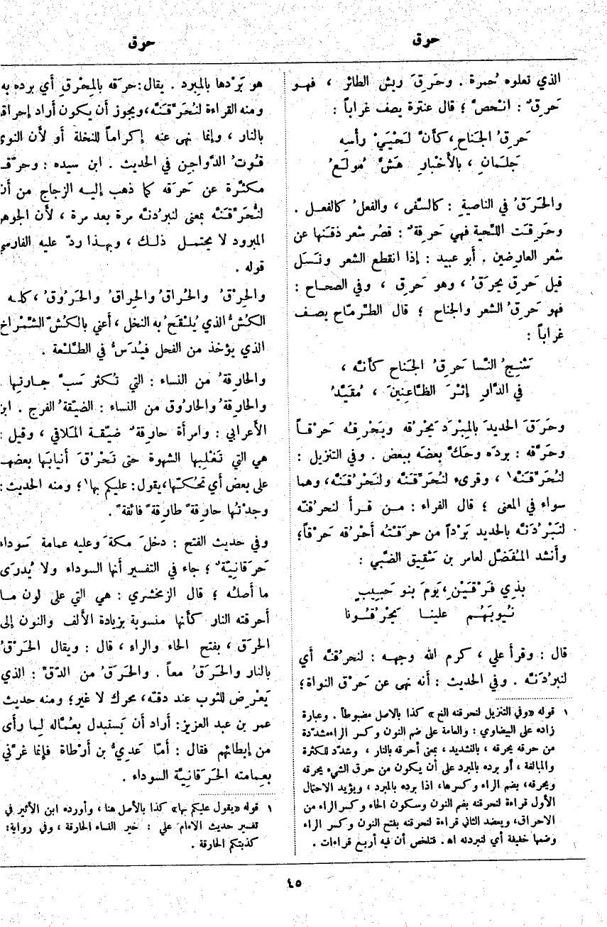 ؛ هُوَ بَرْدها بالمِبرد. يُقَالُ: حرَقه المِحْرقِ أَيْ بَرَدَهُ بِهِ؛ وَمِنْهُ الْقِرَاءَةُ لَنُحَرِّقَنَّهُ، وَيَجُوزُ أَنْ يَكُونَ أَرَادَ إِحْرَاقَهَا بِالنَّارِ، وَإِنَّمَا نَهَى عَنْهُ إِكْرَامًا لِلنَّخْلَةِ أَوْ لأَن النَّوَى قُوتُ الدَّواجِن فِي الْحَدِيثِ. ابْنُ سِيدَهْ: وَحَرَّقَهُ مُكَثَّرَةٌ عَنْ حَرَقه كَمَا ذَهَبَ إِلَيْهِ الزَّجَّاجُ مِنْ أَنَّ لنُّحَرِّقَنَّه بِمَعْنَى لنبرُدنَّه مَرَّةً بَعْدَ مَرَّةٍ، لأَن الْجَوْهَرَ الْمَبْرُودَ لَا يَحْتَمِلُ ذَلِكَ، وَبِهَذَا رَدَّ عَلَيْهِ الْفَارِسِيُّ قَوْلَهُ. والحِرْقُ والحُراقُ والحِراقُ والحَرُوقُ، كُلُّهُ: الكُشُّ الَّذِي يُلْقَح بِهِ النَّخْلُ، أَعْنِي بالكُشّ الشِّمْراخَ الَّذِي يُؤْخَذُ مِنَ الْفَحْلِ فيُدَسُّ فِي الطَّلْعة. والحارِقةُ مِنَ النِّسَاءِ: الَّتِي تُكثر سَبَّ جارتِها. والحارِقةُ والحارُوق مِنَ النِّسَاءِ: الضيّقةُ الْفَرْجِ. ابْنُ الأَعرابي: وَامْرَأَةٌ حارِقةٌ ضَيِّقَةُ المَلاقي، وَقِيلَ: هِيَ الَّتِي تَغْلِبها الشَّهْوَةُ حَتَّى تَحْرُقَ أنيابَها بَعْضَهَا عَلَى بَعْضٍ أَيْ تحُكّها، يَقُولُ: عَلَيْكُمْ بِهَا «2» وَمِنْهُ الْحَدِيثُ: