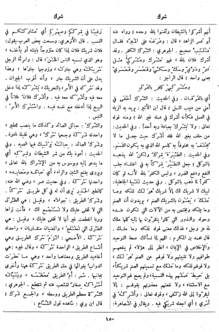 أَنهم أَشركوا بِالشَّيْطَانِ وَآمَنُوا بِاللَّهِ وَحْدَهُ؛ رَوَاهُ عَنْهُ أَبو عُمر الزَّاهِدُ، قَالَ: وعَرَضَه عَلَى المُبرِّد فَقَالَ مُتْلَئِبٌّ صَحِيحٌ. الْجَوْهَرِيُّ: الشِّرْك الْكُفْرُ. وَقَدْ أَشرك فُلَانٌ بِاللَّهِ، فَهُوَ مُشْرِك ومُشْرِكيٌّ مِثْلُ دَوّ ودَوِّيّ وسَكّ وسَكِّيّ وقَعْسَرٍ قَعْسَريّ بِمَعْنًى وَاحِدٍ؛ قَالَ الرَّاجِزُ: