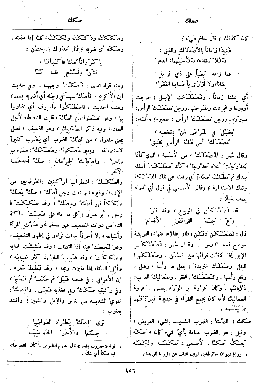 أَي تَضَارَبُوا بِهَا، وَهُوَ افْتَعلوا مِنَ الصَّكِّ، قُلِبَتِ التَّاءُ طَاءً لأَجل الصَّادِ، وَفِيهِ ذِكْرُ الصَّكيكِ، وَهُوَ الضَّعِيفُ، فَعِيلٌ بِمَعْنَى مَفْعُولٍ، مِنَ الصَّكِّ الضَّرْبُ أَيْ يُضْرب كَثِيرًا لِاسْتِضْعَافِهِ. وَبَعِيرٌ مَصْكوك ومُصَكَّكٌ: مَضْرُوبٌ بِاللَّحْمِ «2». واصْطَكَّ الجِرْمانِ: صَكَّ أَحدهُما الْآخَرَ. والصَّكَكُ: اضْطِرَابُ الرُّكبتين والعُرقوبين مِنَ الإِنسان وَغَيْرِهِ، وَالنَّعْتُ رَجُلٌ أَصَكُّ، صَكَّ يَصَكُّ صَكَكاً فَهُوَ أَصَكُّ ومِصَكّ، وَقَدْ صَكِكْتَ يا رجل. أَبو عَمْرٍو: كَلُّ مَا جَاءَ عَلَى فَعِلَتْ سَاكِنَةِ التَّاءِ مِنْ ذَوَاتِ التَّضْعِيفِ فَهُوَ مُدْغَمٌ نَحْوَ صَمَّتِ الْمَرْأَةُ وأَشباهه، إِلَّا أَحرفاً جَاءَتْ نَوَادِرَ فِي إِظْهَارِ التَّضْعِيفِ: وَهُوَ لَحِحَتْ عَيْنُهُ إِذَا الْتَصَقَتْ، وَقَدْ مَشِشَت الدَّابَّةَ وصَكِكتْ، وَقَدْ ضَبِبَ البلدُ إِذَا كَثُرَ ضِبابُه، وأَلِلَ السِّقاء إِذَا تَغَيَّرَتْ رِيحُهُ، وَقَدْ قَطِطَ شَعْرُهُ. ابْنُ الأَعرابي: فِي قَدَمَيْهِ قَبَلٌ ثُمَّ حَنَفٌ ثُمَّ فَحَجٌ، وَفِي رُكْبَتَيْهِ صَكَكٌ وَفِي فَخِذَيْهِ فَجًى. والمِصَكُّ: القويُّ الشَّدِيدُ مِنَ النَّاسِ والإِبل وَالْحَمِيرِ؛ وأَنشد يَعْقُوبُ: