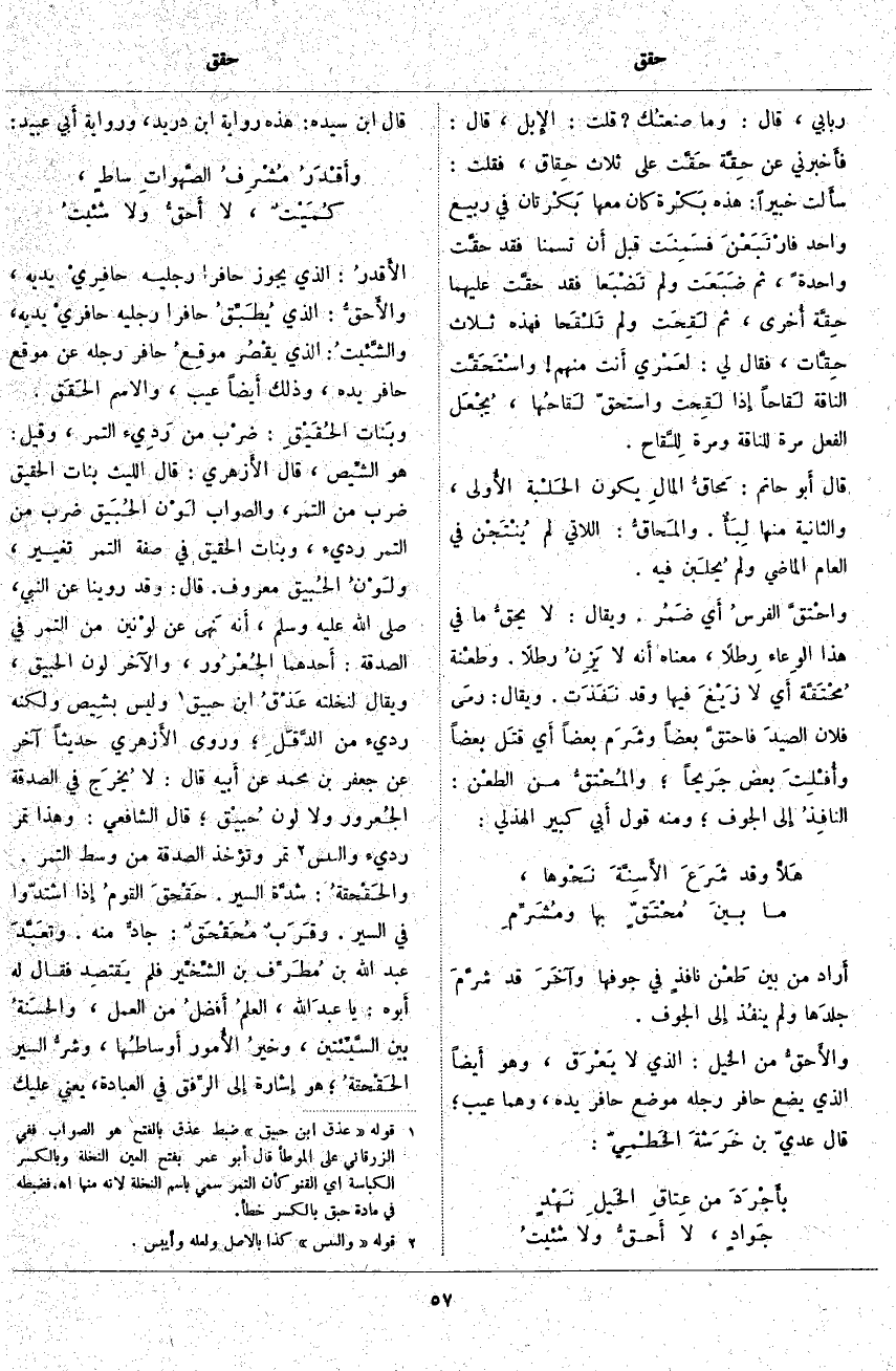 رباني، قَالَ: وَمَا صنعتُك؟ قُلْتُ: الإِبل، قَالَ: فأَخبرني عَنْ حِقَّة حَقَّت عَلَى ثَلَاثِ حِقاق، فَقُلْتُ: سأَلت خَبِيرًا: هَذِهِ بَكْرة كَانَ مَعَهَا بَكْرتان فِي رَبِيعٍ وَاحِدٍ فارْتَبَعْنَ فسَمِنَت قَبْلَ أَن تَسْمَنَا فَقَدْ حقَّت وَاحِدَةً، ثُمَّ ضَبَعَت وَلَمْ تَضْبَعا فَقَدْ حقَّت عَلَيْهِمَا حِقَّة أُخرى، ثُمَّ لَقِحَت وَلَمْ تَلْقَحا فَهَذِهِ ثَلَاثُ حِقَّات، فَقَالَ لِي: لعَمْري أَنت مِنْهُمْ واسْتَحَقَّت النَّاقَةُ لَقاحاً إِذا لَقِحت وَاسْتَحَقَّ لَقاحُها، يُجْعَل الْفِعْلُ مَرَّةً لِلنَّاقَةِ وَمَرَّةً للَّقاح. قَالَ أَبو حَاتِمٍ: مَحاقُّ المالِ يَكُونُ الحَلْبة الأُولى، وَالثَّانِيَةُ مِنْهَا لِبَأٌ. والمَحاقُّ: اللَّاتِي لَمْ يُنْتَجْن فِي الْعَامِ الْمَاضِي وَلَمْ يُحلَبن فِيهِ. واحْتقَّ الفرسُ أَي ضَمُر. وَيُقَالُ: لَا يحقُّ مَا فِي هَذَا الوِعاء رِطْلًا، مَعْنَاهُ أَنه لا يَزِنُ رِطْلًا. وطعْنة مُحْتَقَّة أَي لَا زَيْغَ فِيهَا وَقَدْ نَفَذَت. وَيُقَالُ: رمَى فُلَانٌ الصيدَ فاحتقَّ بَعْضًا وشَرَم بَعْضًا أَي قتَل بَعْضًا وأُفْلِتَ بَعْضٌ جَريحاً؛ والمُحْتقُّ مِنَ الطعْن: النافِذُ إِلى الْجَوْفِ؛ وَمِنْهُ قَوْلُ أَبي كَبِيرٍ الهذلي: