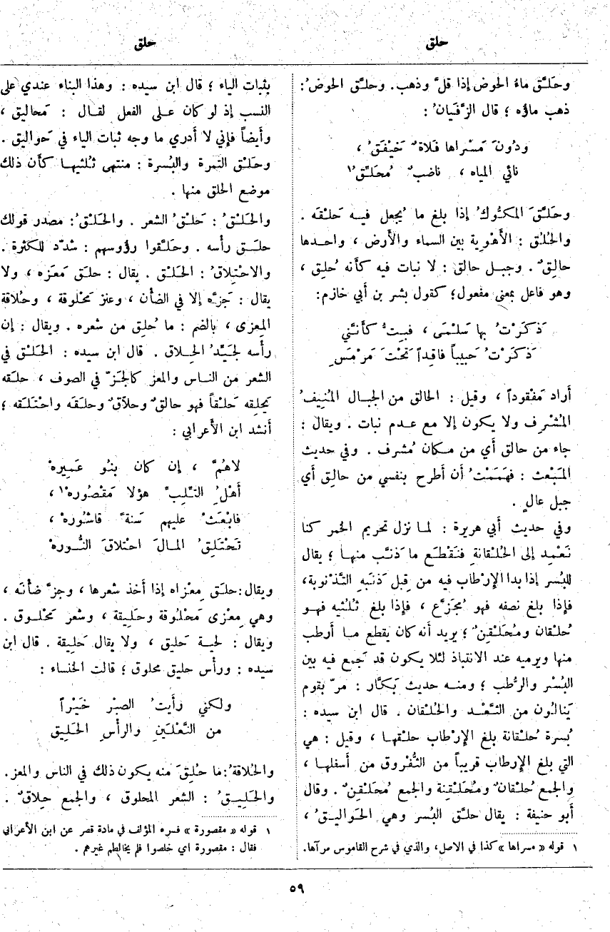 قَالَ ابْنُ سِيدَهْ: بُسرة حُلْقانة بَلَغَ الإِرْطاب حَلْقَهَا وَقِيلَ هِيَ الَّتِي بَلَغَ الإِرْطاب قَرِيبًا مِنَ الثُّفروق مِنْ أَسْفَلِهَا وَالْجَمْعُ حُلْقانٌ ومُحَلْقِنة وَالْجَمْعُ مُحَلْقِنٌ. وَقَالَ أَبو حَنِيفَةَ: يُقَالُ حلَّق البُسر وَهِيَ الحَواليقُ، بِثَبَاتِ الْيَاءِ؛ قَالَ ابْنُ سِيدَهْ: وَهَذَا الْبِنَاءُ عِنْدِي عَلَى النَّسَبِ إِذ لَوْ كَانَ عَلَى الْفِعْلِ لَقَالَ: مَحاليق، وأَيضاً فإِني لَا أَدري مَا وَجْهُ ثَبَاتِ الْيَاءِ فِي حَواليق. وحَلْق التَّمْرَةِ والبُسرة: مُنْتَهَى ثُلثيها كأَن ذَلِكَ مَوْضِعُ الْحَلْقِ مِنْهَا. والحَلْقُ: حَلْقُ الشَّعْرِ. والحَلْقُ: مَصْدَرُ قَوْلِكَ حَلق رأْسه. وحَلَّقوا رؤُوسهم: شَدَّدَ لِلْكَثْرَةِ. والاحْتِلاقُ: الحَلْق. يقال: حَلق مَعَزه، ولا يقال: جَزَّه إِلا فِي الضأْن، وَعَنْزٌ مَحْلوقة، وحُلاقة المِعزى، بِالضَّمِّ: مَا حُلِق مِنْ شَعْرِهِ. وَيُقَالُ: إِن رأْسه لَجيِّد الحِلاق. قَالَ ابْنُ سِيدَهْ: الحَلْق فِي الشَّعْرِ مِنَ النَّاسِ وَالْمَعْزِ كالجَزّ فِي الصُّوفِ، حلَقه يَحلِقه حَلْقاً فَهُوَ حالقٌ وحلاقٌ وحلَقَه واحْتَلَقه؛ أَنشد ابْنُ الأَعرابي: