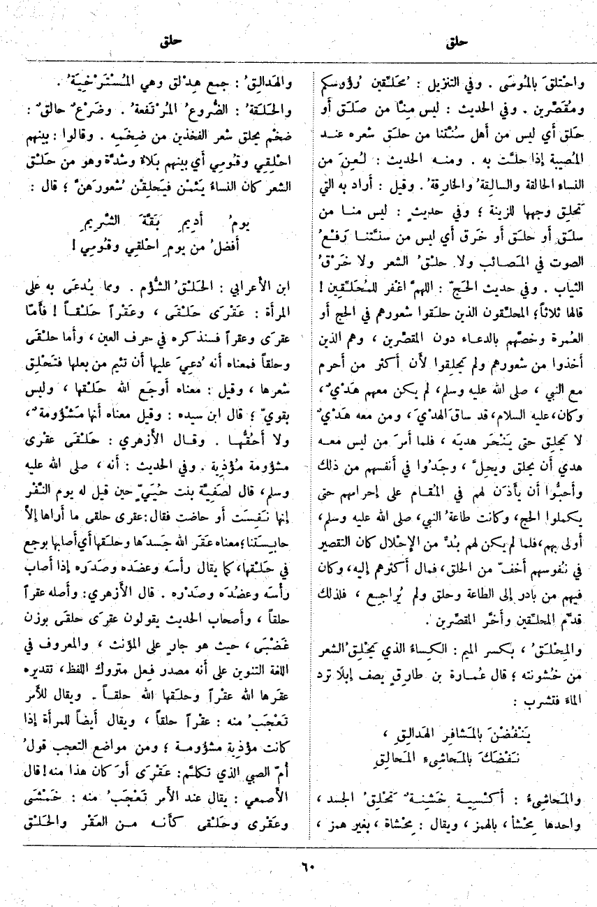 والمَحاشِئُ: أَكْسِية خَشِنةٌ تَحْلِقُ الْجَسَدَ، وَاحِدُهَا مِحْشأ، بِالْهَمْزِ، وَيُقَالُ: مِحْشاة، بِغَيْرِ هَمْزٍ، والهَدالِقُ: جَمْعُ هِدْلق وَهِيَ المُسْتَرْخِيَةُ. والحَلَقةُ: الضُّروعُ المُرْتَفعةُ. وضَرْعٌ حالقٌ: ضخْم يَحْلِقُ شَعْرَ الْفَخْذَيْنِ مِنْ ضِخَمِه. وَقَالُوا: بَيْنَهُمُ احْلِقِي وقُومي أَي بَيْنَهُمْ بَلاءٌ وشدَّة وَهُوَ مِنْ حَلْق الشَّعْرِ كَانَ النساءُ يَئمْن فيَحلِقْن شُعورَهنَّ؛ قَالَ: