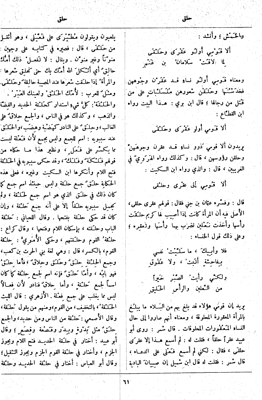 يُرِيدُ إِن قَوْمِي هَؤُلَاءِ قَدْ بَلَغَ بِهِمْ مِنَ البَلاء مَا يبلُغ بالمرأَة الْمَعْقُورَةِ الْمَحْلُوقَةِ، وَمَعْنَاهُ أَنهم صَارُوا إِلى حَالِ النساءِ المَعْقُورات الْمَحْلُوقَاتِ. قَالَ شَمِرٌ: رَوَى أَبو عُبَيْدٍ عَقْرًا حَلْقًا، فَقُلْتُ لَهُ: لَمْ أَسمع هَذَا إِلا عقرَى حلقَى، فَقَالَ: لَكِنِّي لَمْ أَسمع فَعْلى عَلَى الدُّعَاءِ، قَالَ شَمِرٌ: فَقُلْتُ لَهُ قَالَ ابْنُ شُمَيْلٍ إِن صِبيانَ الْبَادِيَةِ يَلْعَبُونَ وَيَقُولُونَ مُطَّيْرَى عَلَى فُعَّيْلى، وَهُوَ أَثقل مِنْ حَلْقَى، قَالَ: فَصَيَّرَهُ فِي كِتَابِهِ عَلَى وَجْهَيْنِ: مُنَوَّنًا وَغَيْرَ منوَّن. وَيُقَالُ: لَا تَفعل ذَلِكَ أُمُّك حالِقٌ أَي أَثْكلَ اللَّهُ أُمَّك بِكَ حَتَّى تَحلِق شَعْرَهَا، والمرأَةُ إِذا حلَقت شَعْرَهَا عِنْدَ الْمُصِيبَةِ حالِقةٌ وحَلْقَى. ومثَلٌ لِلْعَرَبِ: لأُمّك الحَلْقُ وَلِعَيْنِكَ العُبْرُ. والحَلْقَةُ: كلُّ شيءٍ اسْتَدَارَ كحَلْقةِ الْحَدِيدِ والفِضّة وَالذَّهَبِ، وَكَذَلِكَ هُوَ فِي النَّاسِ، وَالْجَمْعُ حِلاقٌ عَلَى الْغَالِبِ، وحِلَقٌ عَلَى النَّادِرِ كهَضْبة وهِضَب، والحَلَقُ عِنْدَ سِيبَوَيْهِ: اسْمٌ لِلْجَمْعِ وَلَيْسَ بِجَمْعٍ لأَن فَعْلة لَيْسَتْ مِمَّا يكسَّر عَلَى فَعَلٍ، وَنَظِيرُ هَذَا مَا حَكَاهُ مِنْ قَوْلِهِمْ فَلْكَةٌ وفَلَكٌ، وَقَدْ حَكَى سِيبَوَيْهِ فِي الحَلْقة فَتْحَ اللَّامِ وأَنكرها ابْنُ السِّكِّيتِ وَغَيْرُهُ، فَعَلَى هَذِهِ الْحِكَايَةِ حلَقٌ جَمْعُ حلَقة وَلَيْسَ حِينَئِذٍ اسْمَ جَمْعٍ كَمَا كَانَ ذَلِكَ فِي حلَق الَّذِي هُوَ اسْمُ جَمْعٍ لحَلْقة، وَلَمْ يَحمِل سِيبَوَيْهِ حلَقاً إِلا عَلَى أَنه جَمْعُ حَلْقة وإِن كَانَ قَدْ حَكَى حلَقة بِفَتْحِهَا. وَقَالَ اللِّحْيَانِيُّ: حَلْقة الْبَابِ وحلَقته، بإِسكان اللَّامِ وَفَتْحِهَا، وَقَالَ كُرَاعٌ: حلْقةُ الْقَوْمِ وحلَقتهم، وَحَكَى الأُمَوِيُّ: حِلْقة الْقَوْمِ، بِالْكَسْرِ، قَالَ: وَهِيَ لُغَةُ بَنِي الحرت بْنِ كَعْبٍ، وَجَمْعُ الحِلْقةِ حِلَقٌ وحَلَق وحِلاقٌ، فأَما حِلَقٌ فَهُوَ بابُه، وأَما حَلَقٌ فإِنه اسْمٌ لِجَمْعِ حِلْقة كَمَا كَانَ اسْمًا لِجَمْعِ حَلْقةٍ، وأَما حِلاقٌ فَنَادِرٌ لأَن فِعالًا لَيْسَ مِمَّا يَغْلِبُ عَلَى جَمْعِ فِعْلة. الأَزهري: قَالَ اللَّيْثُ الحَلْقةُ، بالتخفِيف، مِنَ الْقَوْمِ، وَمِنْهُمْ مَنْ يَقُولُ حَلَقة، وَقَالَ الأَصمعي: حَلْقة مِنَ النَّاسِ وَمِنْ حَدِيدٍ، وَالْجَمْعُ حِلَقٌ مِثْلَ بَدْرةٍ وبِدَر وقَصْعة وقِصَعٍ؛ وَقَالَ أَبو عُبَيْدٍ: أَختار فِي حلَقة الْحَدِيدِ فَتْحَ اللَّامِ وَيَجُوزُ الْجَزْمُ، وأَختار فِي حلْقة الْقَوْمِ الْجَزْمَ وَيَجُوزُ التَّثْقِيلُ؛ وَقَالَ أَبو الْعَبَّاسِ: أَختار فِي حلْقة الْحَدِيدِ وحلْقة