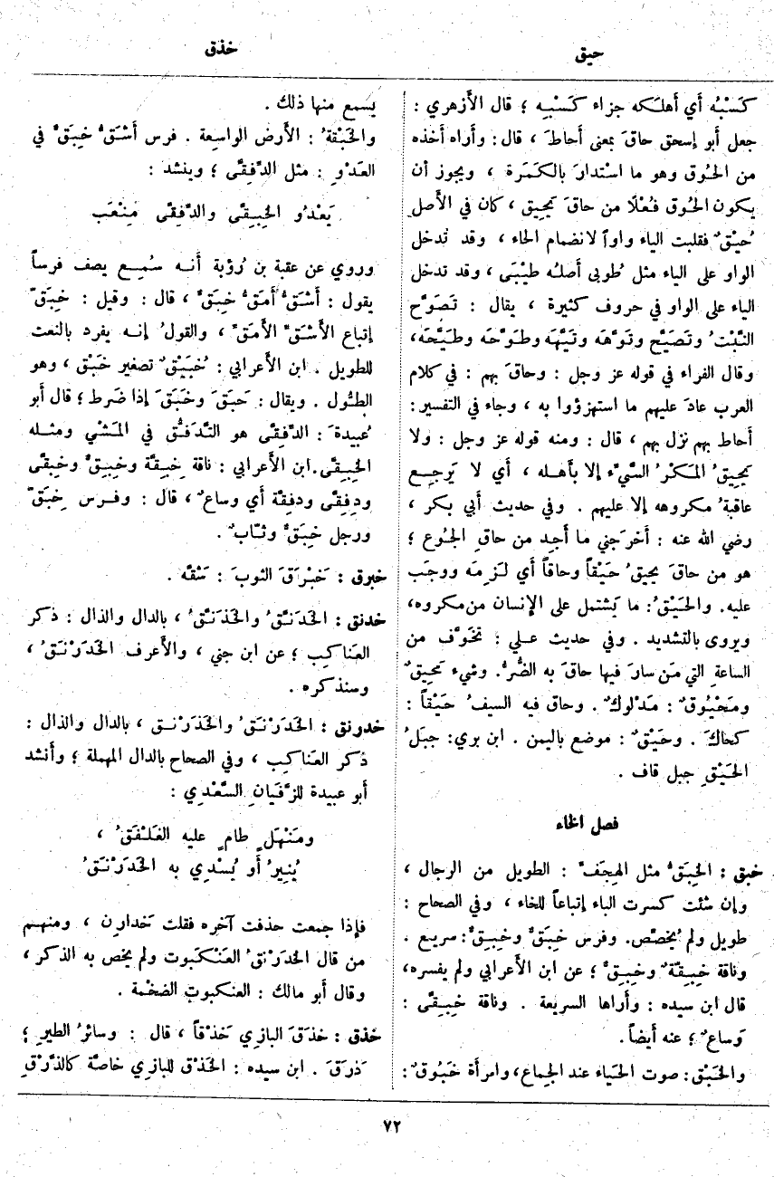 خبق: الخِبَقُّ مِثْلُ الهِجَفِّ: الطَّوِيلُ مِنَ الرِّجَالِ، وإِن شِئْتَ كَسَرْتَ الْبَاءَ إِتباعاً لِلْخَاءِ، وَفِي الصِّحَاحِ: طَوِيلٌ وَلَمْ يُخصِّص. وَفَرَسٌ خِبَقٌّ وخِبِقٌّ: سَرِيعٌ. وَنَاقَةٌ خِبِقّةٌ وخِبِقٌّ؛ عَنِ ابْنِ الأَعرابي وَلَمْ يُفَسِّرْهُ، قَالَ ابْنُ سِيدَهْ: وأَراها السَّرِيعَةَ. وَنَاقَةٌ خِبِقَّى: وَساعٌ؛ عَنْهُ أَيضاً. والخَبْق: صَوْتُ الحَياء عِنْدَ الجِماع، وامرأَة خَبُوقٌ: يُسْمَعُ مِنْهَا ذَلِكَ. والخَبْقةُ: الأَرض الواسِعة. فَرَسٌ أَشَقٌّ خِبَقٌّ فِي العَدْوِ: مِثْلُ الدِّفِقَّى؛ وَيُنْشَدُ: