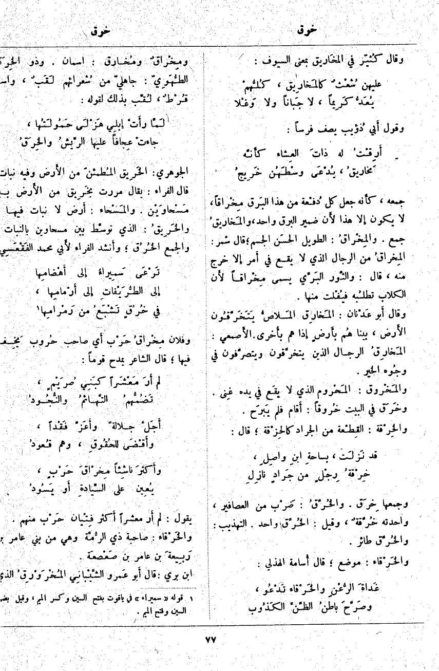 جَمْعُهُ، كَأَنَّهُ جَعَلَ كُلَّ دُفْعة مِنْ هَذَا البَرق مِخْراقاً، لَا يَكُونُ إِلَّا هَذَا لأَن ضَمِيرَ الْبَرْقِ وَاحِدٌ، والمَخاريقُ جَمْعٌ. والمِخْراقُ: الطَّوِيلُ الحَسن الْجِسْمِ؛ قَالَ شَمِرٌ: المِخراقُ مِنَ الرِّجَالِ الَّذِي لَا يَقَعُ فِي أَمْرٍ إِلَّا خَرَجَ مِنْهُ، قَالَ: والثَّور البَرِّي يُسَمَّى مِخْراقاً لأَن الْكِلَابَ تطلبُه فيُفْلت مِنْهَا. وَقَالَ أَبو عدْنان: المَخارِق المَلاصُّ يَتَخَرَّقُون الأَرض، بَيْنَا هُم بأَرضٍ إِذَا هُمْ بأُخرى. الأَصمعي: المَخارِقُ الرِّجَالُ الَّذِينَ يتخرَّقون ويتصرَّفون فِي وجُوه الْخَيْرِ. والمَخْروق: المَحْروم الَّذِي لَا يقَع فِي يَدِهِ غِنى. وخَرَق فِي الْبَيْتِ خُروقاً: أَقام فَلَمْ يَبرَح. والخِرْقة: القِطْعة مِنَ الْجَرَادِ كالحِزْقة؛ قَالَ: