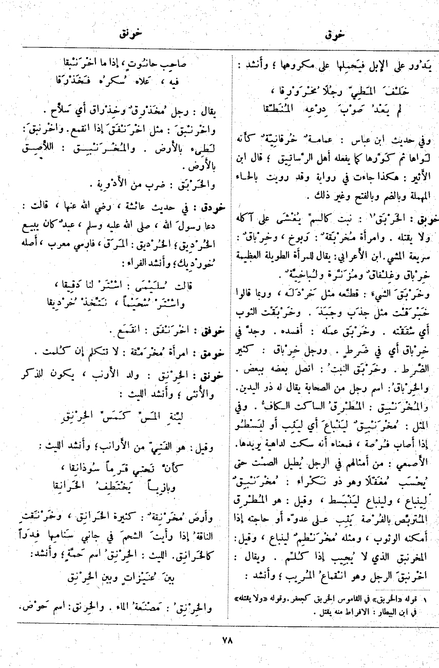 خربق: الخَرْبَقُ «1». نَبْتٌ كالسمِّ يُغْشَى عَلَى آكِلِهِ وَلَا يَقْتُلُهُ. وَامْرَأَةٌ مُخرْبَقةٌ: رَبوخ، وخِرْباقٌ. سَرِيعَةُ الْمَشْيِ. ابْنُ الأَعرابي: يُقَالُ لِلْمَرْأَةِ الطَّوِيلَةِ الْعَظِيمَةِ خِرْباق وغِلْفاقٌ ومُزَنَّرة ولُباخِيَّةٌ. وخَرْبَقَ الشَّيْءَ: قطَّعه مِثْلَ خَرْدَلَه، وَرُبَّمَا قَالُوا خَبْرَقْت مِثْلَ جذَب وجَبَذَ. وخَرْبَقْت الثَّوْبَ أَي شقَقْته. وخَرْبَق عَمَله: أَفسده. وجدَّ فِي خِرْباق أَي فِي ضَرِطٍ. وَرَجُلٌ خِرْباق: كَثِيرُ الضَّرِط. وخَرْبَق النبتُ: اتَّصَلَ بَعْضُهُ بِبَعْضٍ. والخِرْباقُ: اسْمُ رَجُلٍ مِنَ الصَّحَابَةِ يُقَالُ لَهُ ذُو الْيَدَيْنِ. والمُخْرَنْبِق: المُطْرِقُ السَّاكِتُ الكافُّ. وَفِي الْمَثَلِ: مُخْرَنْبِقٌ ليَنْباعَ أَي ليَثِب أَو ليَسْطُو إِذَا أَصَابَ فُرْصة، فَمَعْنَاهُ أَنه سَكَتَ لِدَاهِيَةٍ يُرِيدُهَا. الأَصمعي: مِنْ أَمثالهم فِي الرَّجُلِ يُطيل الصْمت حَتَّى يُحْسَب مُغَفّلًا وَهُوَ ذُو نَكْراء: مُخْرَنْبِقٌ لِينباع، وَلِيَنْبَاعَ ليَنْبَسط، وَقِيلَ: هُوَ المُطْرِق المُتَرَبِّص بالفُرْصة يَثِب عَلَى عَدُوِّهِ أَو حَاجَتِهِ إِذَا أَمكنه الْوُثُوبُ، وَمِثْلُهُ مُخْرَنْطِمٌ لِيَنْبَاعَ، وَقِيلَ: الْمُخْرَنْبِقُ الَّذِي لَا يُجِيب إِذَا كُلِّم. وَيُقَالُ: اخْرنبق الرَّجُلُ وَهُوَ انْقماعُ المُرِيب؛ وأَنشد: