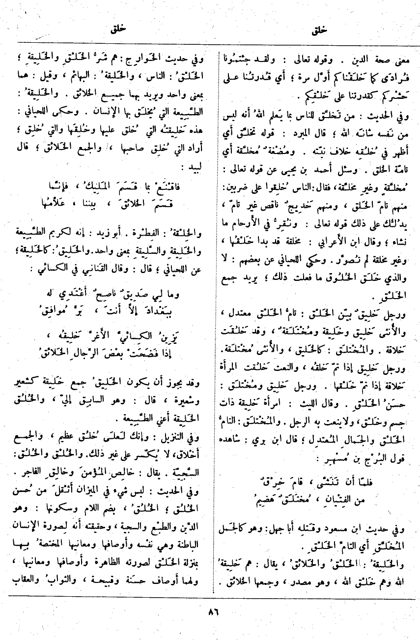 ، وَالْجَمْعُ أَخْلاق، لَا يُكسّر عَلَى غَيْرِ ذَلِكَ. والخُلْق والخُلُق: السَّجِيّة. يُقَالُ: خالِصِ المُؤْمنَ وخالِقِ الْفَاجِرَ. وَفِي الْحَدِيثِ: