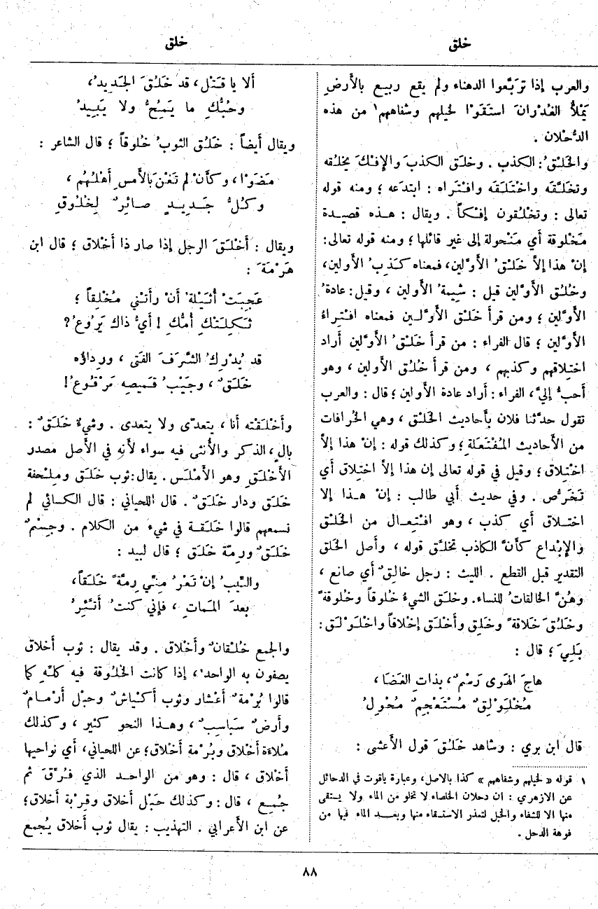 وَالْعَرَبُ إِذا تَرَبَّعوا الدَّهْنَاءَ وَلَمْ يَقَعَ رَبِيعٌ بالأَرضِ يَمْلأُ الغُدْرانَ استَقَوْا لِخَيْلِهِمْ وَشِفَاهِهِمْ «2» مِنْ هَذِهِ الدُّحْلان. والخَلْقُ: الْكَذِبُ. وخلَق الكذبَ والإِفْكَ يخلُقه وتخَلَّقَه واخْتَلَقَه وافْتراه: ابتدَعه؛ وَمِنْهُ قَوْلُهُ تَعَالَى: وَتَخْلُقُونَ إِفْكاً