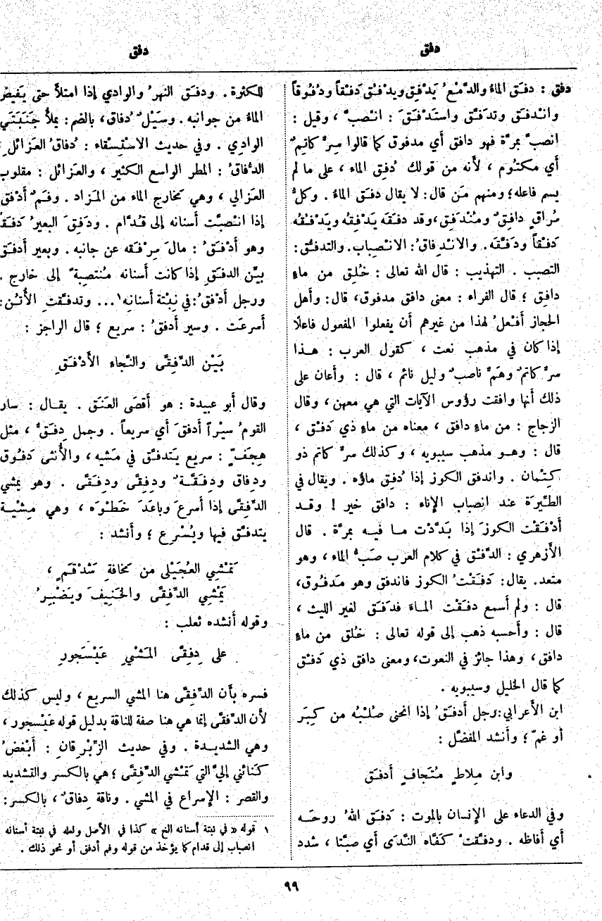 ؛ الدُّفاقُ: الْمَطَرُ الْوَاسِعُ الْكَثِيرُ، والعَزائل: مَقْلُوبُ العَزالي، وَهِيَ مَخارج الْمَاءِ مِنَ المَزاد. وفَمٌ أَدْفقُ إِذَا انْصبَّت أَسنانه إِلى قُدَّام. ودَفِقَ البعيرُ دَفَقاً وَهُوَ أَدْفَقُ: مالَ مِرْفَقه عَنْ جَانِبِهِ. وَبَعِيرٌ أَدفَق بيِّن الدفَقِ إِذَا كَانَتْ أَسنانه مُنتصِبةً إِلَى خارج. وَرَجُلٌ أَدْفقُ: فِي نِبْتة أَسنانِه «3» ... وتدفَّقتِ الأُتُن: أَسرعَت. وَسَيْرٌ أَدفقُ: سَرِيعٌ؛ قَالَ الرَّاجِزُ: