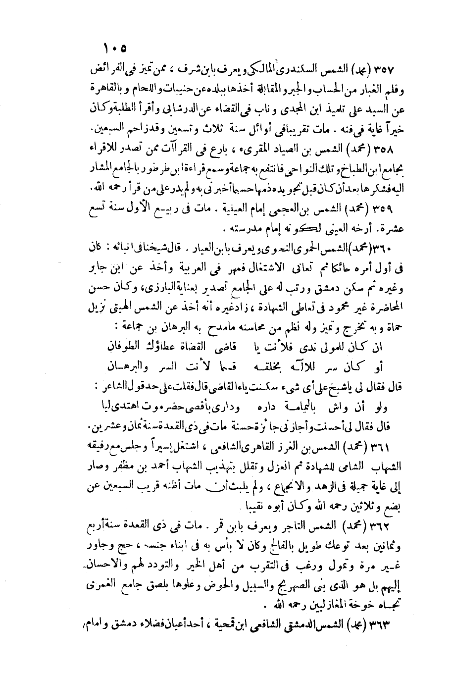 362 - مُحَمَّد الشَّمْس التَّاجِر وَيعرف بِابْن قمر. / مَاتَ فِي ذِي الْقعدَة سنة أَربع وَثَمَانِينَ بعد توعك طَوِيل بالفالج وَكَانَ لَا بَأْس بِهِ فِي أَبنَاء جنسه، حج وجاور غير مرّة وتمول وَرغب فِي التَّقَرُّب من أهل الْخَيْر والتودد لَهُم وَالْإِحْسَان إِلَيْهِم بل هُوَ الَّذِي بنى الصهريج والسبيل والحوض وعلوها بلصق جَامع الغمري تجاه خوهة المغازليين رَحمَه الله.