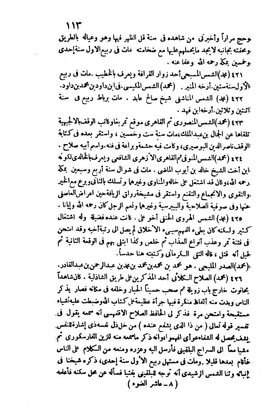 425 - مُحَمَّد الشَّمْس الْهَرَوِيّ الْحَنَفِيّ أَخُو عَليّ. / كَانَت عِنْده فَضِيلَة وَله اشْتِغَال كثير وَلكنه كَانَ بطيء الْفَهم سيئ الْأَخْلَاق لم يصل إِلَى رُتْبَة أَخِيه وَقد امتحن فِي فتْنَة تمر وعذب أَنْوَاع الْعَذَاب ثمَّ خلص وَكَذَا ابْتُلِيَ بهم فِي الْوَقْعَة الثَّانِيَة ثمَّ قيل أَنه قتل، قَالَه التقي الْكرْمَانِي وكتبته هُنَا حدسا.