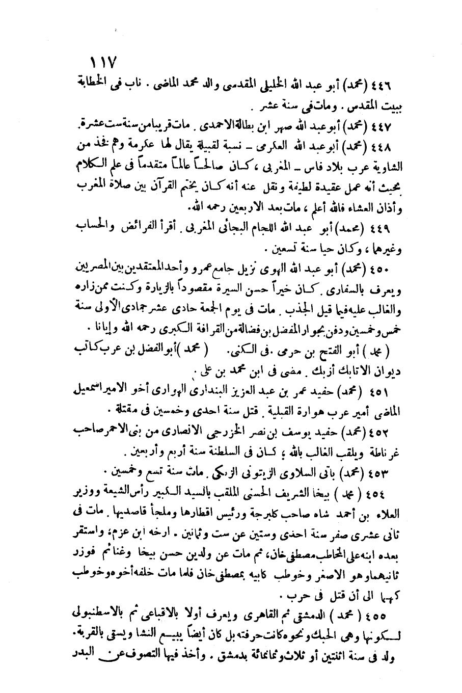 453 - مُحَمَّد باتي السلاوي الزيتوني الزبكي. / مَاتَ سنة تسع وَخمسين. 454 مُحَمَّد بيخا الشريف الحسني الملقب بالسيد الْكَبِير / رَأس الشِّيعَة ووزير الْعَلَاء بن أَحْمد شاه صَاحب كلبرجة وَرَئِيس أقطارها وملجأ قاصديها. مَاتَ فِي ثَانِي عشرى صفر سنة إِحْدَى وَسِتِّينَ عَن سِتّ وَثَمَانِينَ. أرخه ابْن عزم، وَاسْتقر بعده ابْنه على الْمُخَاطب مصطفى خَان، ثمَّ)