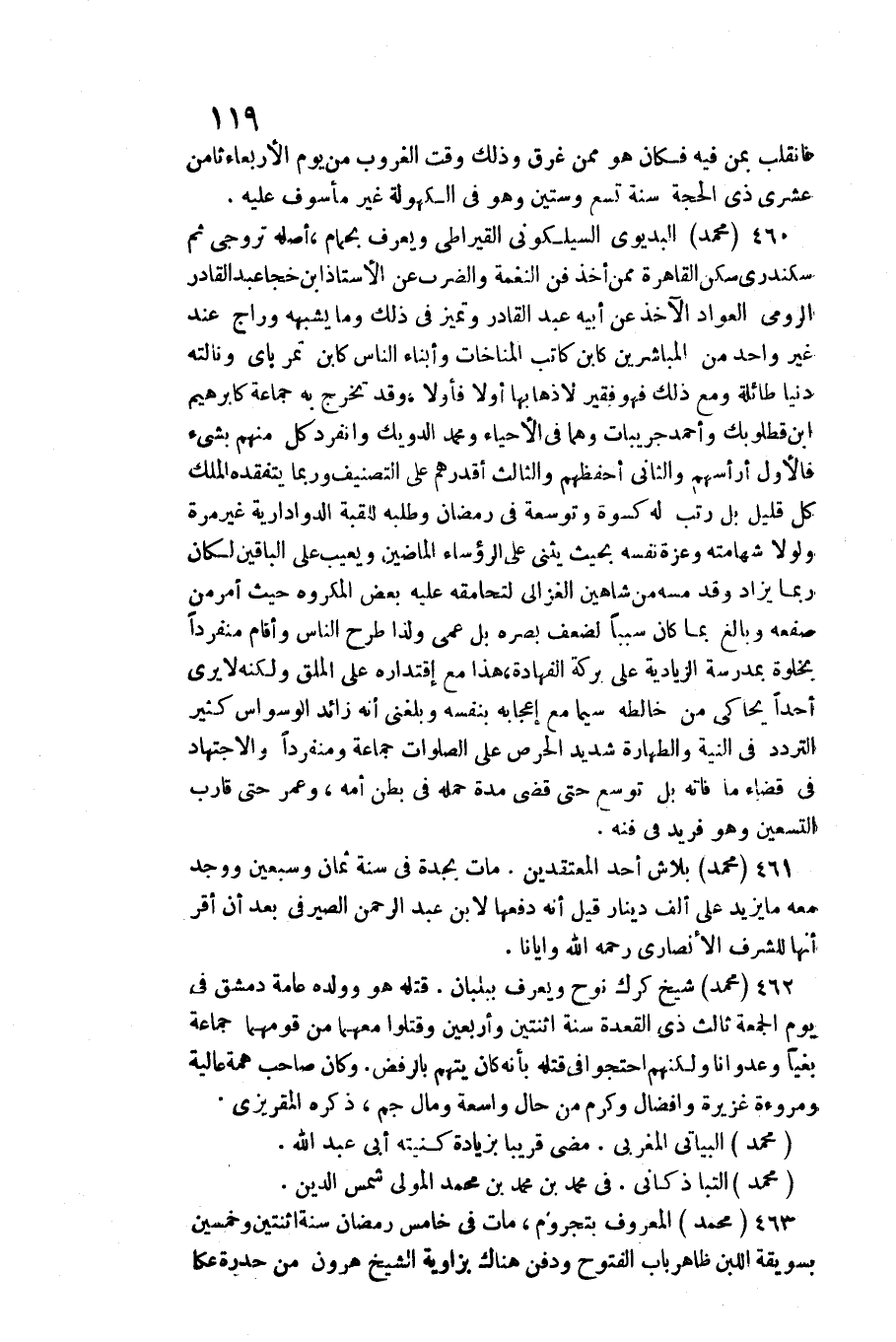460 - مُحَمَّد البديوي السيلكوني القيراطي وَيعرف بحمام، أَصله تروجي ثمَّ سكندري سكن الْقَاهِرَة / مِمَّن أَخذ فن النغمة وَالضَّرْب عَن الْأُسْتَاذ ابْن خجا عبد الْقَادِر الرُّومِي العواد الْآخِذ عَن أَبِيه عبد الْقَادِر وتميز فِي ذَلِك وَمَا يُشبههُ وراج عِنْد غير وَاحِد من المباشرين كَابْن كَاتب المناخات وَأَبْنَاء النَّاس كَابْن تمر باي ونالته دنيا طائلة وَمَعَ ذَلِك فَهُوَ فَقير لإذهابها أَولا فأولا، وَقد تخرج بِهِ جمَاعَة كإبراهيم بن قطلوبك وَأحمد جريبات وهما فِي الْأَحْيَاء وَمُحَمّد الدويك وَانْفَرَدَ كل مِنْهُم بِشَيْء فَالْأول أرأسهم وَالثَّانِي أحفظهم وَالثَّالِث أقدرهم على التصنيف وَرُبمَا يتفقده الْملك كل قَلِيل بل رتب لَهُ كسْوَة وتوسعة فِي رَمَضَان وَطَلَبه للقبة الدوادارية غير مرّة وَلَوْلَا شهامته وَعزة نَفسه بِحَيْثُ يثني على الرؤساء الماضين ويعيب على البَاقِينَ لَكَانَ رُبمَا يُزَاد وَقد مَسّه من شاهين الْغَزالِيّ لتحامقه عَلَيْهِ بعض الْمَكْرُوه حَيْثُ أَمر من صفعه وَبَالغ بِمَا كَانَ سَببا لضعف بَصَره بل عمي وَلذَا طرح النَّاس وَأقَام مُنْفَردا بخلوة بمدرسة الزيادية على بركَة الفهادي، هَذَا مَعَ اقتداره على الملق وَلكنه لَا يرى أحدا يحاكي من خالطه سِيمَا مَعَ إعجابه بِنَفسِهِ وَبَلغنِي أَنه زَائِد الوسواس كثير التَّرَدُّد فِي النِّيَّة وَالطَّهَارَة شَدِيد الْحِرْص على الصَّلَوَات جمَاعَة ومنفردا وَالِاجْتِهَاد فِي قَضَاء مَا فَاتَهُ بل توسع حَتَّى قضى مُدَّة حمله فِي بطن أمه، وَعمر حَتَّى قَارب التسعين وَهُوَ فريد فِي فنه.