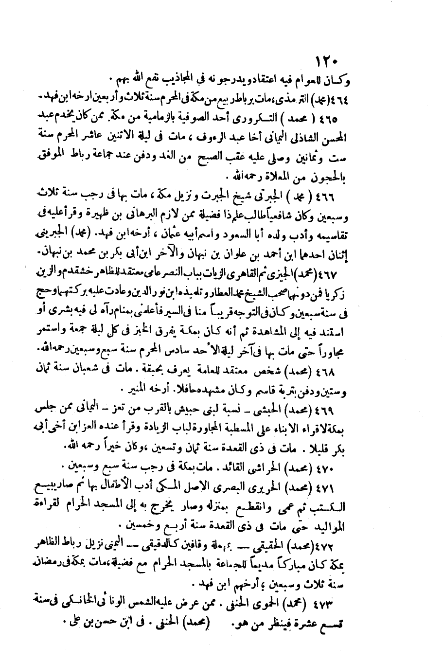 466 - مُحَمَّد الجبرتي شيخ الجبرت ونزيل مَكَّة، / مَاتَ بهَا فِي رَجَب سنة ثَلَاث وَسبعين وَكَانَ شافعيا طَالب علم ذَا فَضِيلَة مِمَّن لَازم البرهاني بن ظهيرة وَقَرَأَ عَلَيْهِ فِي تقاسيمه وأدب وَلَده أَبَا السُّعُود وَاسم أَبِيه عُثْمَان، أرخه ابْن فَهد.