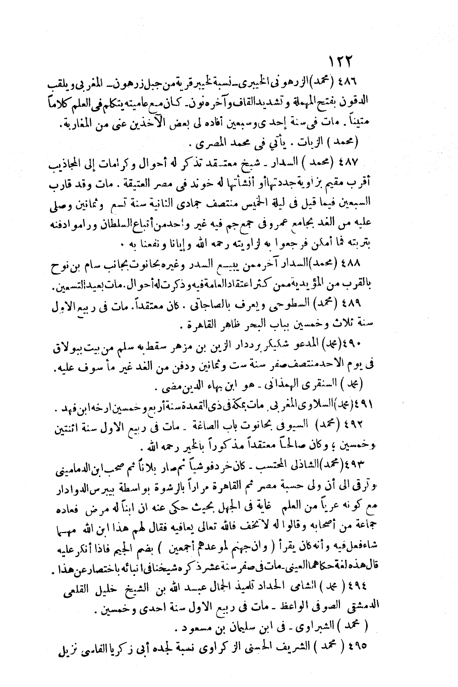 486 - مُحَمَّد الزرهوني الْخَيْبَرِيّ نِسْبَة لخيبر قَرْيَة من جبل زرهون المغربي / ويلقب الدقون بِفَتْح الْمُهْملَة وَتَشْديد الْقَاف وَآخره نون كَانَ مَعَ عاميته يتَكَلَّم فِي الْعلم كلَاما متينا. مَاتَ فِي سنة إِحْدَى وَسبعين أَفَادَهُ لي بعض الآخذين عني من المغاربة.