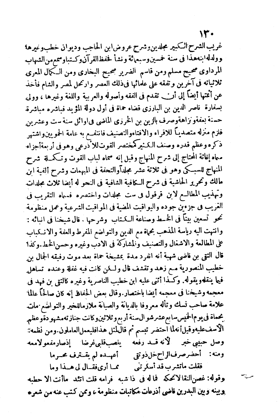 قدره وصنف الْكثير كمختصر الْقُوت للْأَذْرَعِيّ وَهُوَ فِي أَرْبَعَة أَجزَاء سَمَّاهُ إغاثة الْمُحْتَاج إِلَى شرح الْمِنْهَاج وَقيل إِنَّه سَمَّاهُ لباب الْقُوت وتكملة شرح الْمِنْهَاج للسبكي وَهُوَ فِي ثَلَاثَة عشر مجلدا والتحفة فِي المبهمات وَشرح ألفية ابْن مَالك وتحرير الْحَاشِيَة فِي شرح الكافية الشافية فِي النَّحْو لَهُ أَيْضا ثَلَاث مجلدات وتهذيب الْمطَالع لِابْنِ قرقول فِي سِتّ مجلدات وَاخْتَصَرَهُ فَسَماهُ التَّقْرِيب فِي الْغَرِيب فِي جزءين جوده واليواقيت المضية فِي الْمَوَاقِيت الشَّرْعِيَّة وَعمل منظومة نَحْو تسعين بَيْتا فِي الْخط وصناعة الْكتاب وَشَرحهَا. قَالَ شَيخنَا فِي إنبائه: وانتهت إِلَيْهِ رياسة الْمَذْهَب بحماة مَعَ الدّين والتواضع المفرط والعفة والانكباب على المطالعة والإشغال والتصنيف والمشاركة فِي الْأَدَب وَغَيره وَحسن الْخط. وَكَذَا قَالَ التقي بن قَاضِي شُهْبَة أَنه انْفَرد مُدَّة بمشيخة حماة بعد موت رَفِيقه الْجمال بن خطيب المنصورية مَعَ زهد وتقشف قَالَ وَلَكِن كَانَت فِيهِ غَفلَة وَعِنْده تساهل فِيمَا يَنْقُلهُ ويقوله. وَكَذَا أثنى عَلَيْهِ ابْن خطيب الناصرية وَغَيره كالتقي بن فَهد فِي مُعْجَمه وَشَيخنَا فِي مُعْجَمه أَيْضا بِاخْتِصَار. وَقَالَ بعض الْحفاظ إِنَّه كَانَ صَالحا عَالما عَلامَة صَاحب نسك وتأله مَعْرُوفا بالديانة والصيانة ملازما للخير والتواضع. مَاتَ بحماة فِي يَوْم الْخَمِيس سَابِع عشر شَوَّال سنة أَربع وَثَلَاثِينَ وَكَانَت جنَازَته مَشْهُودَة وَعظم الأسف عَلَيْهِ وَقيل أَنه لما احْتضرَ تَبَسم ثمَّ قَالَ لمثل هَذَا فليعمل الْعَامِلُونَ. وَمن نظمه: