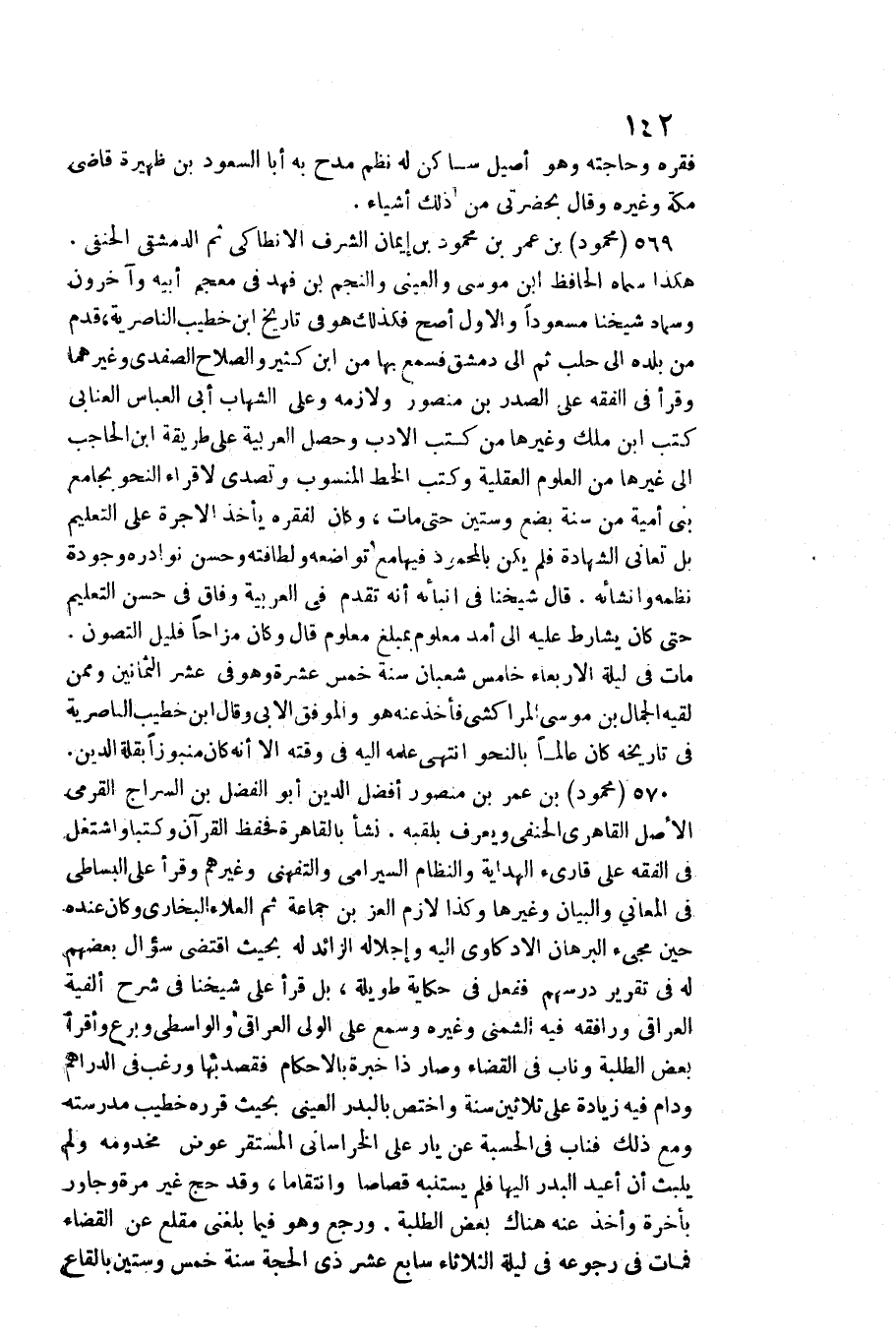 570 - مَحْمُود بن عمر بن مَنْصُور أفضل الدّين أَبُو الْفضل بن السراج القرمي الأَصْل القاهري الْحَنَفِيّ وَيعرف بلقبه. / نَشأ بِالْقَاهِرَةِ فحفظ الْقُرْآن وكتبا واشتغل فِي الْفِقْه على قَارِئ الْهِدَايَة والنظام السيرامي والتفهني وَغَيرهم وَقَرَأَ على الْبِسَاطِيّ فِي الْمعَانِي وَالْبَيَان وَغَيرهَا وَكَذَا لَازم الْعِزّ بن جمَاعَة ثمَّ الْعَلَاء البُخَارِيّ وَكَانَ عِنْده حِين مَجِيء الْبُرْهَان الأدكاوي إِلَيْهِ وإجلاله الزَّائِد لَهُ بِحَيْثُ اقْتضى سُؤال بَعضهم لَهُ فِي تَقْرِير درسهم فَفعل فِي حِكَايَة طَوِيلَة، بل قَرَأَ على شَيخنَا فِي شرح ألفية الْعِرَاقِيّ ورافقه فِيهِ الشمني وَغَيره وَسمع على الْوَلِيّ الْعِرَاقِيّ والواسطي وبرع واقرأ بعض الطّلبَة وناب فِي الْقَضَاء وَصَارَ ذَا خبْرَة بِالْأَحْكَامِ فقصد بهَا وَرغب فِي الدَّرَاهِم ودام فِيهِ زِيَادَة على ثَلَاثِينَ سنة واختص بالبدر الْعَيْنِيّ بِحَيْثُ قَرَّرَهُ خطيب مدرسته وَمَعَ ذَلِك فناب فِي الْحِسْبَة عَن يار على الْخُرَاسَانِي المستقر عوض مخدومه وَلم يلبث أَن أُعِيد الْبَدْر غليها فَلم يستنبه قصاصا وانتقاما، وَقد حج غير مرّة وجاور بِأخرَة وَأخذ عَنهُ هُنَاكَ بعض الطّلبَة. وَرجع وَهُوَ فِيمَا بَلغنِي مقلع عَن الْقَضَاء فَمَاتَ فِي رُجُوعه فِي لَيْلَة الثُّلَاثَاء سَابِع عشرَة ذِي الْحجَّة سنة خمس وَسِتِّينَ بالقاع
