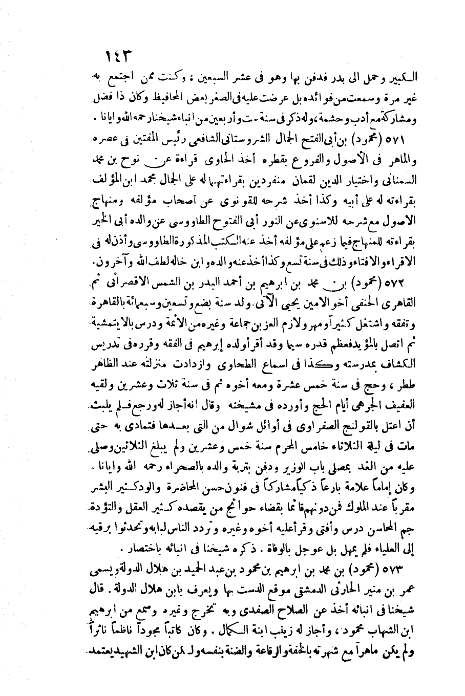 571 - مَحْمُود بن أبي الْفَتْح الْجمال الشروستاني الشَّافِعِي / رَئِيس الْمُفْتِينَ فِي عصره والماهر فِي الْأُصُول وَالْفُرُوع بقطره أَخذ الْحَاوِي قِرَاءَة عَن نوح بن مُحَمَّد السمناني وَاخْتِيَار الدّين لُقْمَان منفردين بقراءتهما لَهُ على الْجمال مُحَمَّد ابْن الْمُؤلف بقرَاءَته لَهُ على أَبِيه وَكَذَا أَخذ شَرحه للقونوي عَن أَصْحَاب مُؤَلفه ومنهاج الْأُصُول مَعَ شَرحه للأسنوي عَن النُّور أبي الْفتُوح الطاووسي عَن وَالِده أبي الْخَيْر بقرَاءَته للمنهاج فِيمَا زعم على مُؤَلفه أَخذ عَنهُ الْكتب الْمَذْكُورَة الطاووسي واذن لَهُ فِي الإقراء والإفتاء وَذَلِكَ ي سنة تسع وَكَذَا أَخذ عَنهُ وَالِده وَابْن خَاله لطف الله وَآخَرُونَ.