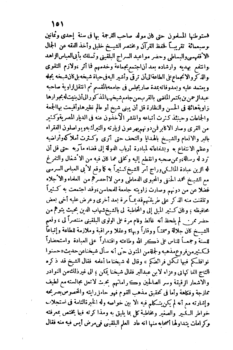 استوطنها الْمُسلمُونَ حَتَّى كَانَ مولد صَاحب التَّرْجَمَة بهَا فِي سنة إِحْدَى وَثَمَانِينَ وَسَبْعمائة تَقْرِيبًا فحفظ الْقُرْآن ومختصر الشَّيْخ خَلِيل وَأخذ الْفِقْه عَن الْجمال الأقفهسي والبساطي وَحضر مواعيد السراج البُلْقِينِيّ وتسلك بِأبي الْعَبَّاس الزَّاهِد وانتفع بهديه وإرشاده بعد أَن اجْتمع بِجَمَاعَة وخدمهم فَمَا أثر، ولازم التَّقْوَى وَالذكر والانجماع على الطَّاعَة إِلَى أَن ترقى وأشير إِلَيْهِ فِي حَيَاة شَيْخه بل كَانَ شَيْخه يجله ويعتمد عَلَيْهِ وَبعد وَفَاته بِمدَّة صَار يجلس فِي جَامِعَة بالمقسم ثمَّ انْتقل لزاوية صَاحبه عبد الرَّحْمَن بن بكتمر الْمَاضِي بِالْقربِ من جَامع شيخهما الْمَذْكُور إِلَى أَن بنيت لَهُ بجوارها زَاوِيَة هائلة فِي الْحسن والنظارة قل أَن يَبْنِي شيخ أَو عَالم نظيرها وأقيمت بهَا الْجُمُعَة وَالْجَمَاعَات وَحِينَئِذٍ كثرت أَتْبَاعه وانتشر الآخذون عَنهُ فِي الديار المصرية وَكثير من الْقرى وَصَارَ الأكابر فَمن دونهم يهرعون لزيارته والتبرك بِهِ وواصلون الْفُقَرَاء بِالْبرِّ والإنعام وَالشَّيْخ بالهدايا والتحف حَتَّى أثرى وَكَثُرت أملاكه وأراضيه وَعظم الِانْتِفَاع بِهِ وبشفاعاته لمبادرة أَرْبَاب الدولة إِلَى قَضَاء مآربه حَتَّى قل أَن ترد لَهُ رِسَالَة، وَمِمَّنْ صَحبه وَانْقطع إِلَيْهِ وتخلى عَمَّا كَانَ فِيهِ من الأشغال والتفرغ لَهُ الزين عبَادَة الْمَالِكِي وراج أَمر الشَّيْخ كثيرا بِهِ كَمَا وَقع لأبي الْعَبَّاس السرسي مَعَ الشَّيْخ مُحَمَّد الْحَنَفِيّ والمحيوي الدماطي وَمن لَا أحصرهم من الْعلمَاء والأجلاء فضلا عَن من دونهم وَصَارَت زاويته جَامِعَة للمحاسن، وَقد اجْتمعت بِهِ كثيرا وتلقنت مِنْهُ الذّكر على طريقتهم قَدِيما مرّة بعد أُخْرَى وَعرض عَلَيْهِ أخي بعض محافيظه وَكَانَ كثير الْميل إِلَيّ والمخاطبة لي بالشيخ شهَاب الدّين بِحَيْثُ يتَوَهَّم من حضر مِمَّن لم يلحظ أَنه غالط وَقَامَ مرّة على الولوي البُلْقِينِيّ منتصرا لي، وَنعم الشَّيْخ كَانَ جلالة وسمتا ووقارا وبهاء وعقلا ومراقبة وملازمة للطاعة واتباعا للسّنة وجمعا للنَّاس على ذكر الله وطاعته واقتدارا على الْعِبَادَة واستحضارا لكثير من فروع مذْهبه ولجملة من الْمُتُون حَتَّى أَنه سَأَلَ شَيخنَا عَن حَدِيث حسنوا نوافلكم فبها تكمل فرائضكم وَقَالَ لَهُ شَيخنَا مَا أعلمهُ فَقَالَ الشَّيْخ قد ذكره التَّاج الْفَاكِهَانِيّ وَعَزاهُ لِابْنِ عبد الْبر فَقَالَ شَيخنَا يُمكن إِلَى غير ذَلِك من النَّوَادِر والأشعار الرقيقة وسر الصَّالِحين وكراماتهم بِحَيْثُ لَا تمل مُجَالَسَته مَعَ لطيف ممازجة وفكاهة وَأما فِي تَحْقِيق مَذْهَب الْقَوْم فَهُوَ حَامِل رايته والمخصوص بصريحه وإشارته مَعَ أَنه لم يكن يتَكَلَّم فِيهِ إِلَّا بَين خواصه وَله الْخِبْرَة التَّامَّة فِي استجلاب خواطر الْكَبِير وَالصَّغِير ومخاطبة كل بِمَا يَلِيق بِهِ ومذاكرته فِيمَا يخْتَص بمعرفته وكرامات)