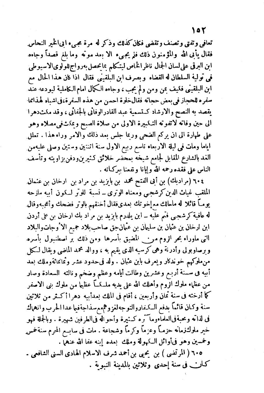 604 - مُرَاد بك بن أبي الْفَتْح مُحَمَّد بن با يزِيد بن مُرَاد بن أرخان بن عُثْمَان الملقب غياث الدّين كرشجي / وَمَعْنَاهُ الوتري نِسْبَة للوتر لكَون أَبِيه مازحه يَوْمًا قَائِلا لَهُ مَا حالك مَعَ إخْوَتك بعدِي فَقَالَ أخنقهم بالوتر فَضَحِك وَأَعْجَبهُ وَقَالَ لَهُ عَافِيَة كرشجي فتم عَلَيْهِ ابْن يلدرم با يزِيد بن مُرَاد بك أرخان بن عَليّ أردن بن أرخان بن عُثْمَان بن سُلَيْمَان بن عُثْمَان جق صَاحب بِلَاد جَمِيع الأوجات والبلاد الَّتِي مَا وَرَاء بَحر الرّوم من الْمضيق بأسرها وَمن ذَلِك بر إصطنبول بأسره وبر صاوبولي وأدرنة وَهِي كرسيه الَّذين يُقيم بِهِ، ووالد مُحَمَّد الْمَاضِي وَيُقَال لكل من مُلُوكهمْ خوندكار وَيعرف بِابْن عُثْمَان. ولد فِي حُدُود عشر وَثَمَانمِائَة وَملك بعد أَبِيه فِي سنة أَربع وَعشْرين وطالت أَيَّامه وَعظم وضخم ونالته السَّعَادَة وَصَارَ من عُظَمَاء مُلُوك الرّوم وَأهْلك الله على يَدَيْهِ ملكا عَظِيما من مُلُوك بني الْأَصْفَر كَمَا أرخته فِي سنة ثَمَان وَأَرْبَعين، أَقَامَ فِي الْملك بعد أَبِيه دهرا أَكثر من ثَلَاثِينَ سنة وَكَانَ قَائِما بِدفع الْكفَّار والتوجه لغزوهم مَعَ سذاجة فِيمَا عدا الْحَرْب وانهماك فِي لذاته ومحبة فِي الْعلمَاء ومآثره كَثِيرَة وأحواله فِي الطَّرفَيْنِ شهيرة. وَبِالْجُمْلَةِ فَهُوَ خير مُلُوك زَمَانه حزما وعزما وكرما وشجاعة. مَاتَ فِي سَابِع الْمحرم سنة خمس وَخمسين وَهُوَ فِي أَوَائِل الكهولة وَملك عَبده ابْنه عَفا الله عَنْهُمَا.