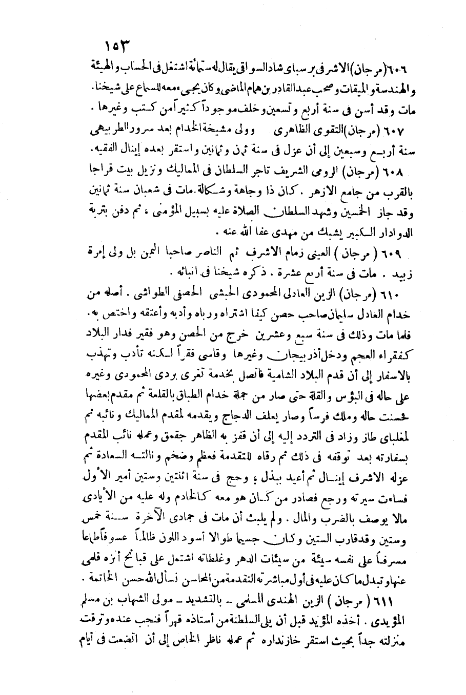 606 - مرجان الأرفي برسباي شاد السواقي يُقَال لَهُ سِتّمائَة / اشْتغل فِي الْحساب والهيئة والهندسة والميقات وَصَحب عبد الْقَادِر بن همام الْمَاضِي وَكَانَ يَجِيء مَعَه للسماع على شَيخنَا.
