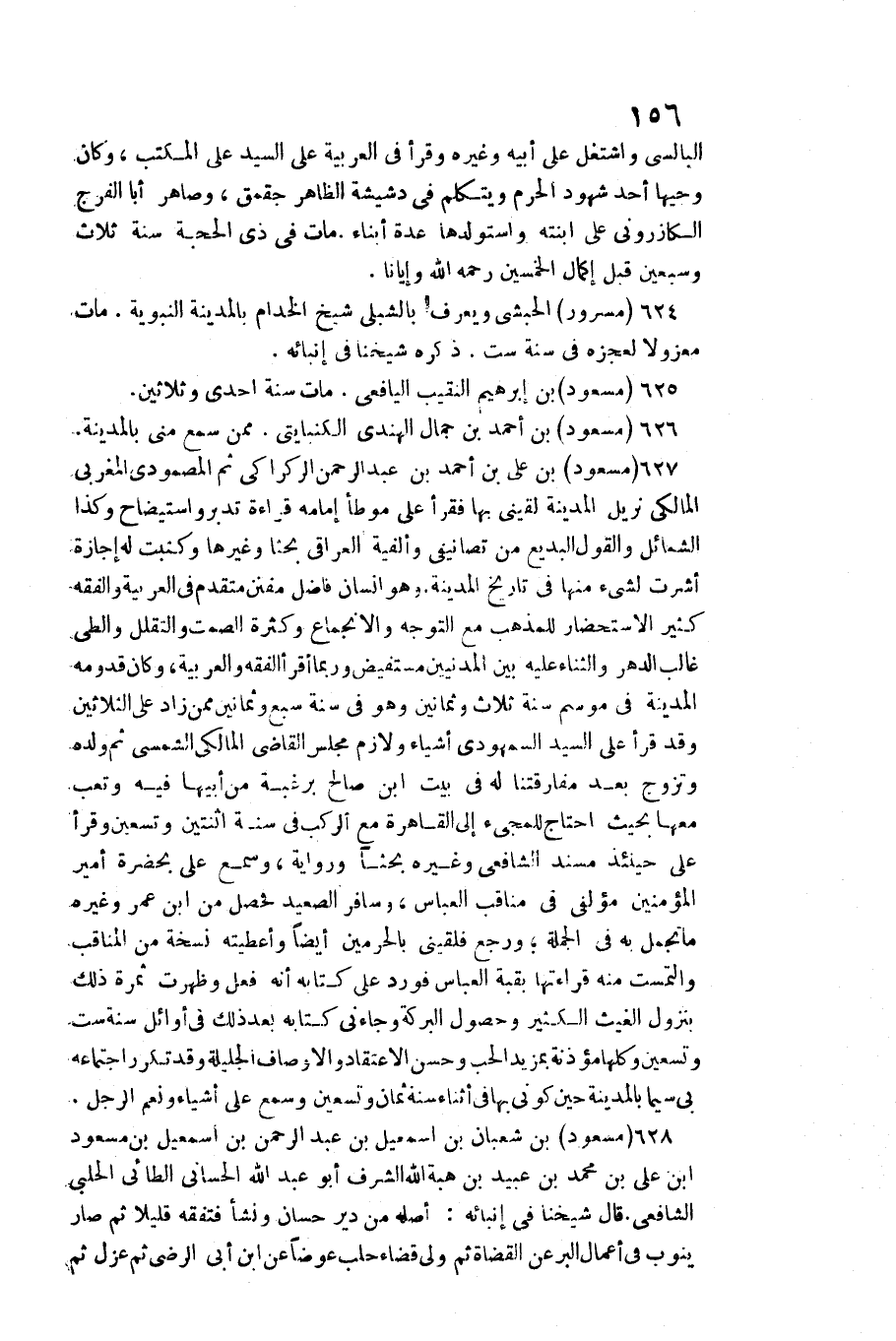 627 - مَسْعُود بن عَليّ بن أَحْمد بن عبد الرَّحْمَن الركراكي ثمَّ المصمودي المغربي الْمَالِكِي نزيل الْمَدِينَة / لَقِيَنِي بهَا فَقَرَأَ عَليّ موطأ إِمَامه قِرَاءَة تدبر واستيضاح وَكَذَا الشَّمَائِل وَالْقَوْل البديع من تصانيفي وألفية الْعِرَاقِيّ بحثا وَغَيرهَا وكتبت لَهُ إجَازَة أَشرت لشَيْء مِنْهَا فِي تَارِيخ الْمَدِينَة. وَهُوَ إِنْسَان فَاضل مفنن مُتَقَدم فِي الْعَرَبيَّة وَالْفِقْه كثير الاستحضار للْمَذْهَب مَعَ التَّوَجُّه والانجماع وَكَثْرَة الصمت والتقلل والطي غَالب الدَّهْر وَالثنَاء عَلَيْهِ بَين الْمَدَنِيين مستفيض وَرُبمَا أَقرَأ الْفِقْه والعربية، وَكَانَ قدومه الْمَدِينَة فِي موسم سنة ثَلَاث وَثَمَانِينَ وَهُوَ فِي سنة سبع وَثَمَانِينَ مِمَّن زَاد على الثَّلَاثِينَ وَقد قَرَأَ على السَّيِّد السمهودي أَشْيَاء ولازم مجْلِس القَاضِي الْمَالِكِي الشمسي ثمَّ وَلَده وَتزَوج بعد مفارقتنا لَهُ فِي بَيت ابْن صَالح برغبة من أَبِيهَا فِيهِ وتعب مَعهَا بِحَيْثُ احْتَاجَ للمجيء إِلَى الْقَاهِرَة مَعَ الركب فِي سنة اثْنَتَيْنِ وَتِسْعين وَقَرَأَ عَليّ حِينَئِذٍ مُسْند الشَّافِعِي وَغَيره بحثا وَرِوَايَة، وَسمع عَليّ بِحَضْرَة أَمِير الْمُؤمنِينَ مُؤَلَّفِي فِي مَنَاقِب الْعَبَّاس، وسافر الصَّعِيد فَحصل من ابْن عمر وَغَيره مَا تجمل بِهِ فِي الْجُمْلَة وَرجع فلقيني