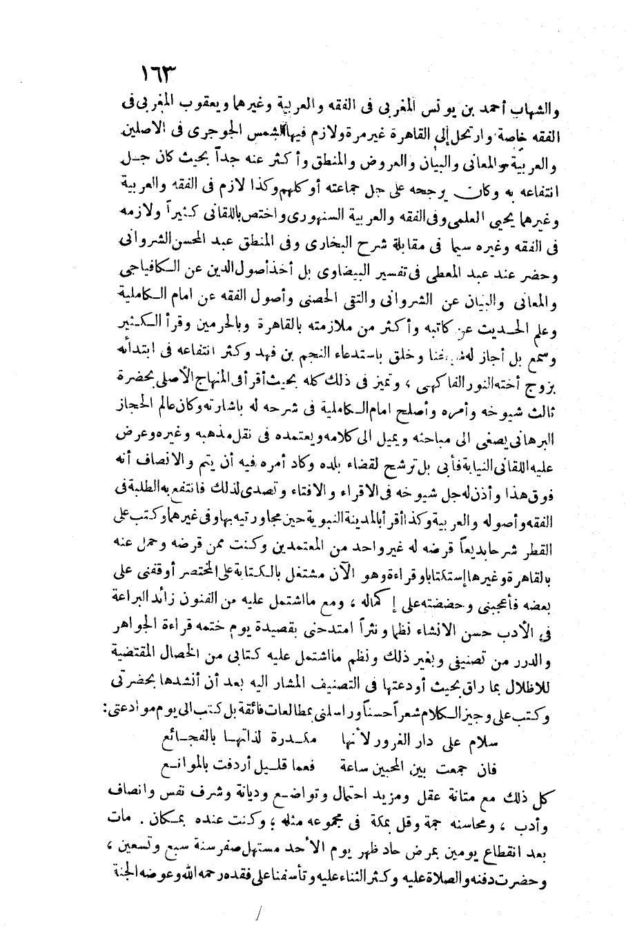 والشهاب أَحْمد بن يُونُس المغربي فِي الْفِقْه والعربية وَغَيرهمَا وَيَعْقُوب المغربي فِي الْفِقْه خَاصَّة وارتحل إِلَى الْقَاهِرَة غير مرّة ولازم فِيهَا الشَّمْس الْجَوْجَرِيّ فِي الْأَصْلَيْنِ والعربية والمعاني وَالْبَيَان وَالْعرُوض والمنطق وَأكْثر عَنهُ جدا بِحَيْثُ)