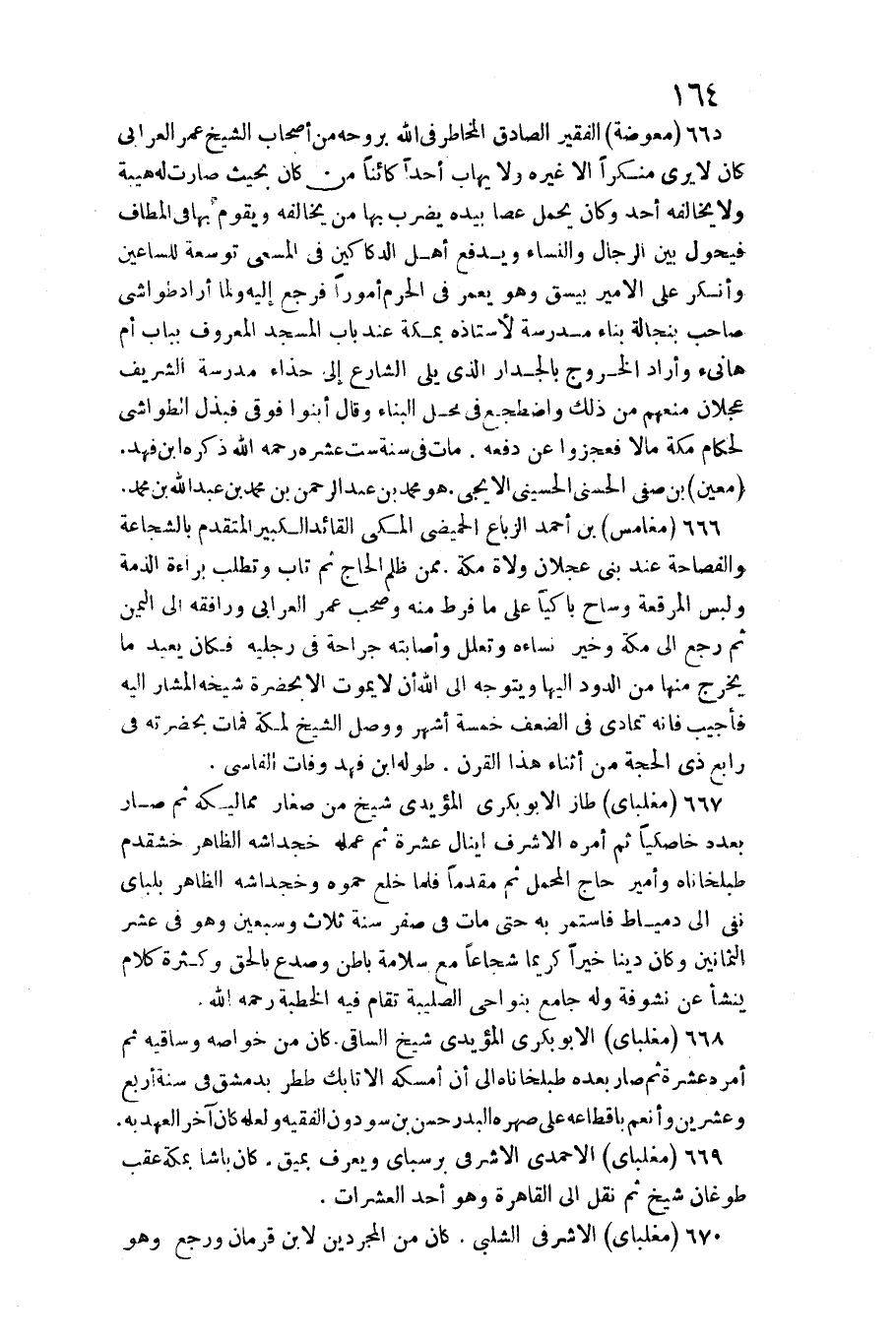 666 - مغامس بن أَحْمد الزباع الحميضي الْمَكِّيّ / الْقَائِد الْكَبِير الْمُتَقَدّم بالشجاعة والفصاحة عِنْد بني عجلَان وُلَاة مَكَّة. مِمَّن ظلم الْحَاج ثمَّ تَابَ وتطلب بَرَاءَة الذِّمَّة وَلبس المرقعة وساح باكيا على مَا فرط مِنْهُ وَصَحب عمر العرابي ورافقه إِلَى الْيمن ثمَّ رَجَعَ إِلَى مَكَّة وَخير نِسَاءَهُ وتعلل وأصابته جِرَاحَة فِي رجلَيْهِ فَكَانَ يُعِيد مَا يخرج مِنْهَا من الدُّود إِلَيْهَا وَيتَوَجَّهُ إِلَى الله أَن لَا يَمُوت إِلَّا بِحَضْرَة شَيْخه الْمشَار إِلَيْهِ فَأُجِيب فَإِنَّهُ تَمَادى فِي الضعْف خَمْسَة أشهر وَوصل الشَّيْخ لمَكَّة فَمَاتَ بِحَضْرَتِهِ فِي رَابِع ذِي الْحجَّة من أثْنَاء هَذَا الْقرن. طوله ابْن فَهد وَفَاتَ الفاسي.