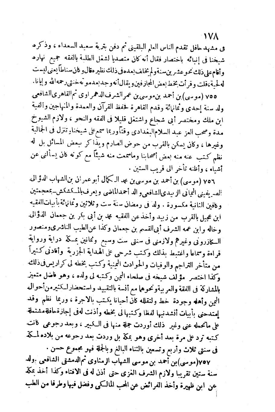 755 - مُوسَى بن أَحْمد بن مُوسَى بن عمر الشّرف الدهمراوي ثمَّ القاهري الشَّافِعِي / ولد سنة إِحْدَى وَثَمَانمِائَة وَقدم الْقَاهِرَة فحفظ الْقُرْآن والعمدة والمنهاجين وألفية ابْن ملك ومختصر أبي شُجَاع واشتغل قَلِيلا فِي الْفِقْه والنحو، ولازم الشُّيُوخ مُدَّة وَصَحب الْعِزّ عبد السَّلَام الْبَغْدَادِيّ وقتا وَرُبمَا سمع على شَيخنَا وتنزل فِي الجمالية وَغَيرهَا، وَكَانَ يسكن بِالْقربِ من حَوْض الصارم ويذاكر بعض الْمسَائِل بل لَهُ نظم كتب عَنهُ مِنْهُ بعض أَصْحَابنَا وَمَا سَمِعت مِنْهُ شَيْئا مَعَ كَونه كَانَ يسألني عَن أَشْيَاء، وَأَظنهُ تَأَخّر إِلَى قريب السِّتين.