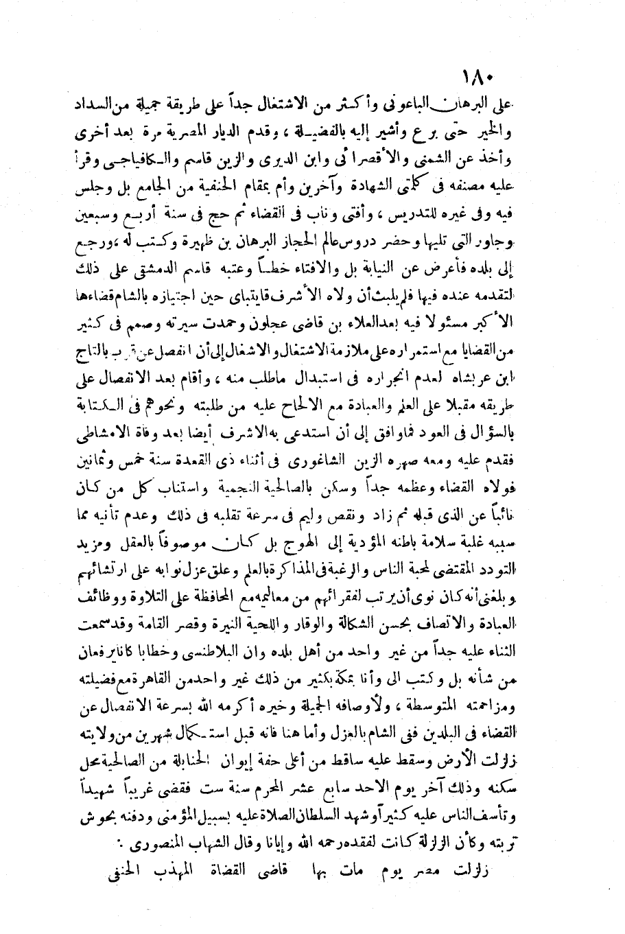 بِكَثِير من ذَلِك غير وَاحِد من الْقَاهِرَة مَعَ فضيلته ومزاحمته المتوسطة، ولأوصافه الجميلة وخيره أكْرمه الله بِسُرْعَة الِانْفِصَال عَن الْقَضَاء فِي البلدين فَفِي الشَّام بِالْعَزْلِ وَأما هُنَا فَإِنَّهُ قبل استكمال شَهْرَيْن من ولَايَته زلزلت الأَرْض وَسقط عَلَيْهِ سَاقِط من أَعلَى حفة إيوَان الْحَنَابِلَة من الصالحية مَحل سكنه وَذَلِكَ آخر يَوْم الْأَحَد سَابِع عشر الْمحرم سنة سِتّ فَقضى غَرِيبا شَهِيدا وتأسف النَّاس عَلَيْهِ كثيرا وَشهد السُّلْطَان الصَّلَاة عَلَيْهِ بسبيل المؤمني وَدَفنه بحوش تربته وَكَأن الزلزلة كَانَت لفقده رَحمَه الله وإيانا وَقَالَ الشهَاب المنصوري: