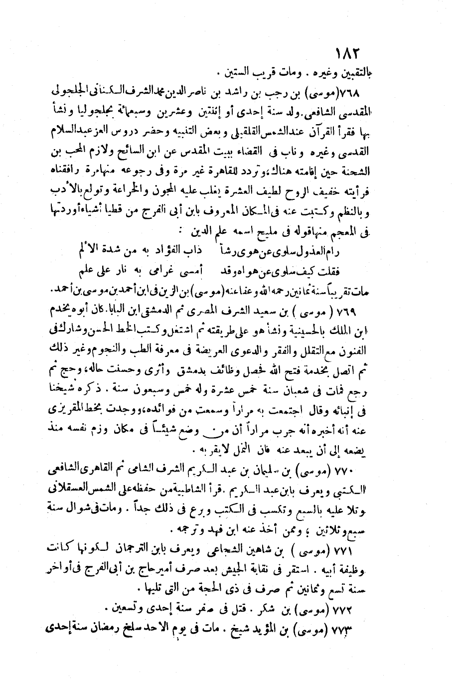 771 - مُوسَى بن شاهين الشجاعي وَيعرف بِابْن الترجمان / لكَونهَا كَانَت وَظِيفَة أَبِيه. اسْتَقر فِي نقابة الْجَيْش بعد صرف أَمِير حَاج بن أبي الْفرج فِي أَوَاخِر سنة تسع وَثَمَانِينَ ثمَّ صرف فِي ذِي الْحجَّة من الَّتِي تَلِيهَا.