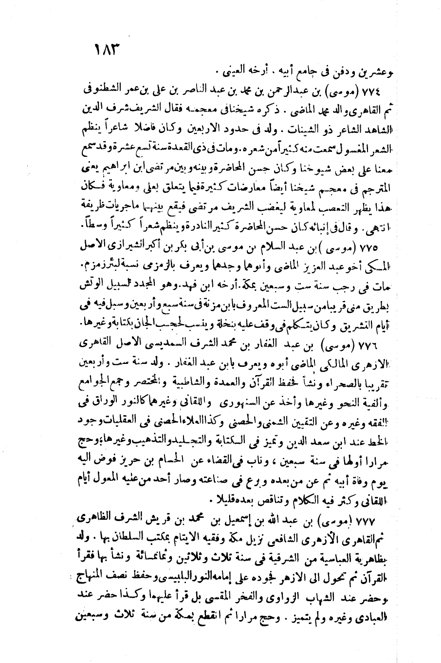 774 - مُوسَى بن عبد الرَّحْمَن بن مُحَمَّد بن عبد النَّاصِر بن عَليّ بن عمر الشطنوفي ثمَّ القاهري وَالِد مُحَمَّد الْمَاضِي. / ذكره شَيخنَا فِي مُعْجَمه فَقَالَ الشريف شرف الدّين الشَّاهِد الشَّاعِر ذُو الشينات. ولد فِي حُدُود الْأَرْبَعين وَكَانَ فَاضلا شَاعِرًا ينظم الشّعْر المغسول سَمِعت مِنْهُ كثيرا من شعره. وَمَات فِي ذِي الْقعدَة سنة تسع عشرَة وَقد سمع مَعنا على بعض شُيُوخنَا وَكَانَ حسن المحاضرة وَبَينه وَبَين مرتضى ابْن إِبْرَاهِيم يَعْنِي المترجم فِي مُعْجم شَيخنَا أَيْضا معارضات كَثِيرَة فِيمَا يتَعَلَّق بعلي وَمُعَاوِيَة فَكَانَ هَذَا يظْهر التعصب لمعاوية ليغضب الشريف مرتضى فَيَقَع بَينهمَا ماجريات ظريفة انْتهى. وَقَالَ فِي إنبائه كَانَ حسن المحاضرة كَثِيرَة النادرة وينظم شعرًا كثيرا وسطا.