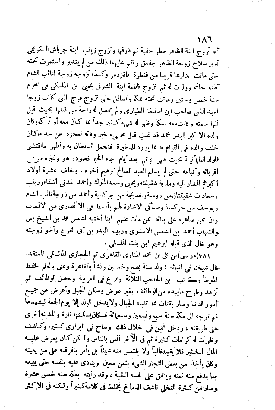 781 - مُوسَى بن عَليّ بن مُحَمَّد الْمَنَاوِيّ القاهري ثمَّ الْحِجَازِي الْمَالِكِي / المعتقد. قَالَ شَيخنَا فِي إنبائه: ولد سنة بضع وَخمسين وَنَشَأ بِالْقَاهِرَةِ وعني بِالْعلمِ فحفظ الْمُوَطَّأ وَكتب ابْن الْحَاجِب الثَّلَاثَة وبرع فِي الْعَرَبيَّة وَحصل الْوَظَائِف ثمَّ تزهد وَطرح مَا بِيَدِهِ من الْوَظَائِف بِغَيْر عوض وَسكن الْجَبَل وَأعْرض عَن جَمِيع أُمُور الدُّنْيَا وَصَارَ يقتات مِمَّا تنبته الْجبَال وَلَا يدْخل الْبَلَد إِلَّا يَوْم الْجُمُعَة ليشهدها ثمَّ توجه إِلَى مَكَّة سنة سبع وَتِسْعين وَسَبْعمائة فَكَانَ يسكنهَا تَارَة وَالْمَدينَة أُخْرَى على طَرِيقَته، وَدخل الْيمن من خلال ذَلِك وساح فِي البراري كثيرا وَكَاشف وَظَهَرت لَهُ كرامات كَثِيرَة ثمَّ فِي الآخر أنس بِالنَّاسِ وَلَكِن كَانَ يعرض عَلَيْهِ المَال الْكثير فَلَا يقبله غَالِبا وَلَا يلْتَمس مِنْهُ شَيْئا بل يَأْمر بتفرقته على من يُعينهُ وَكَانَ يَأْخُذ من بعض التُّجَّار الشَّيْء بِثمن معِين وينادي عَلَيْهِ بِنَفسِهِ حَتَّى يَبِيعهُ بِمَا يدْفع مِنْهُ ثمنه وَينْفق على نَفسه الْبَقِيَّة، وَقد رَأَيْته بِمَكَّة سنة خمس عشرَة وَصَارَ من كَثْرَة التخلي ناشف الدِّمَاغ يخلط فِي كَلَامه كثيرا وَلكنه فِي الْأَكْثَر