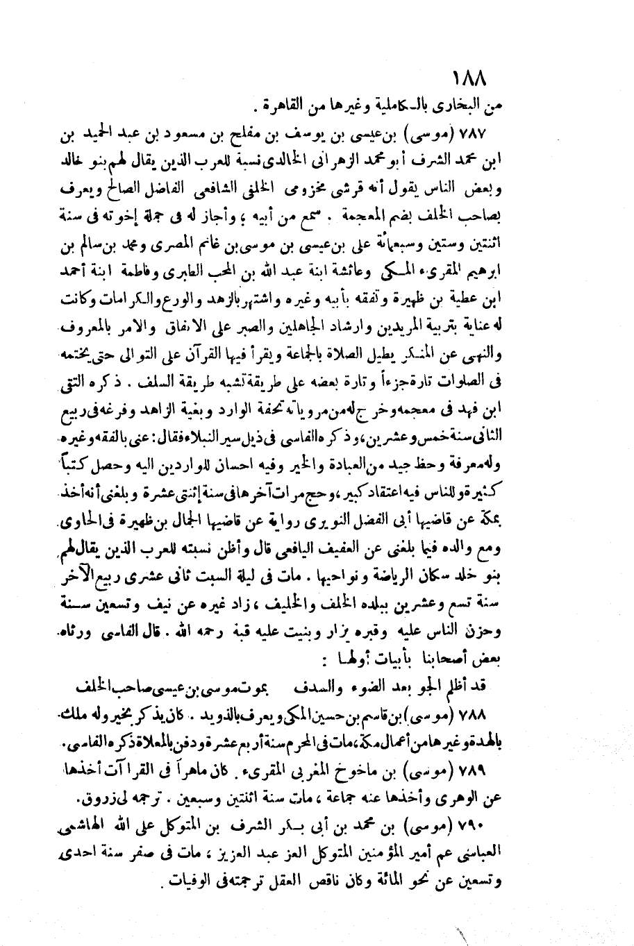 787 - مُوسَى بن عِيسَى بن يُوسُف بن مُفْلِح بن مَسْعُود بن عبد الحميد بن ابْن مُحَمَّد الشّرف أَبُو مُحَمَّد الزهْرَانِي الخالدي نِسْبَة للْعَرَب الَّذين يُقَال لَهُم بَنو خَالِد وَبَعض النَّاس يَقُول أَنه قرشي مخزومي الخلفي الشَّافِعِي الْفَاضِل الصَّالح وَيعرف بِصَاحِب الْخلف / بِضَم الْمُعْجَمَة. سمع من أَبِيه وَأَجَازَ لَهُ فِي جملَة إخْوَته فِي سنة اثْنَتَيْنِ وَسِتِّينَ وَسَبْعمائة على بن عِيسَى بن مُوسَى)