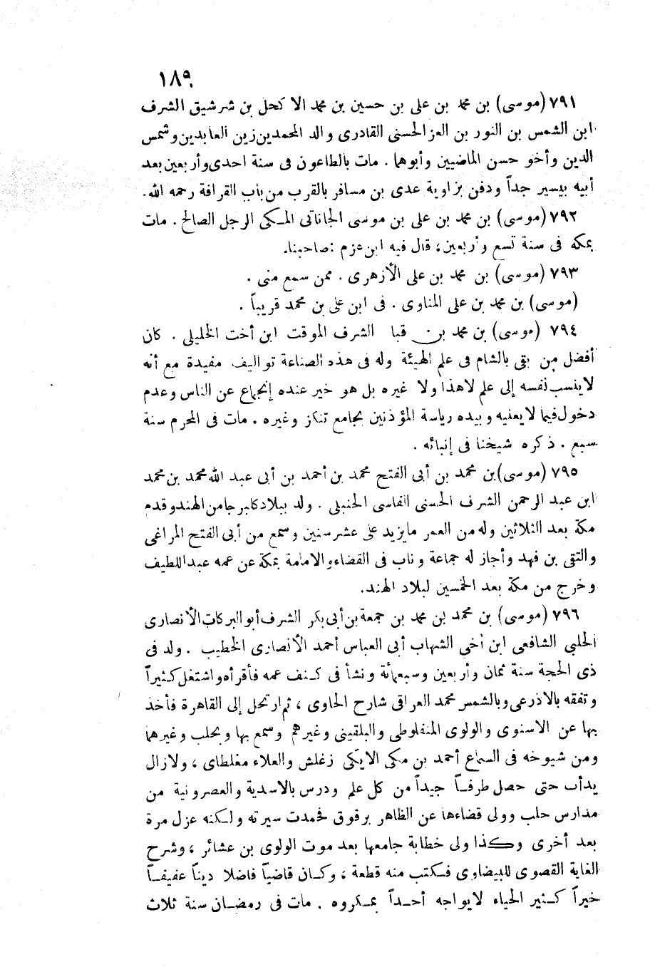 795 - مُوسَى بن مُحَمَّد بن أبي الْفَتْح مُحَمَّد بن أَحْمد بن أبي عبد الله مُحَمَّد بن مُحَمَّد بن عبد الرَّحْمَن الشّرف الحسني الفاسي الْحَنْبَلِيّ. / ولد بِبِلَاد كلبرجا من الْهِنْد وَقدم مَكَّة بعد الثَّلَاثِينَ وَله من الْعُمر مَا يزِيد على عشر سِنِين وَسمع من أبي الْفَتْح المراغي والتقي بن فَهد وَأَجَازَ لَهُ جمَاعَة وناب فِي الْقَضَاء والإمامة بِمَكَّة عَن عَمه عبد اللَّطِيف وَخرج من مَكَّة بعد الْخمسين لبلاد الْهِنْد.
