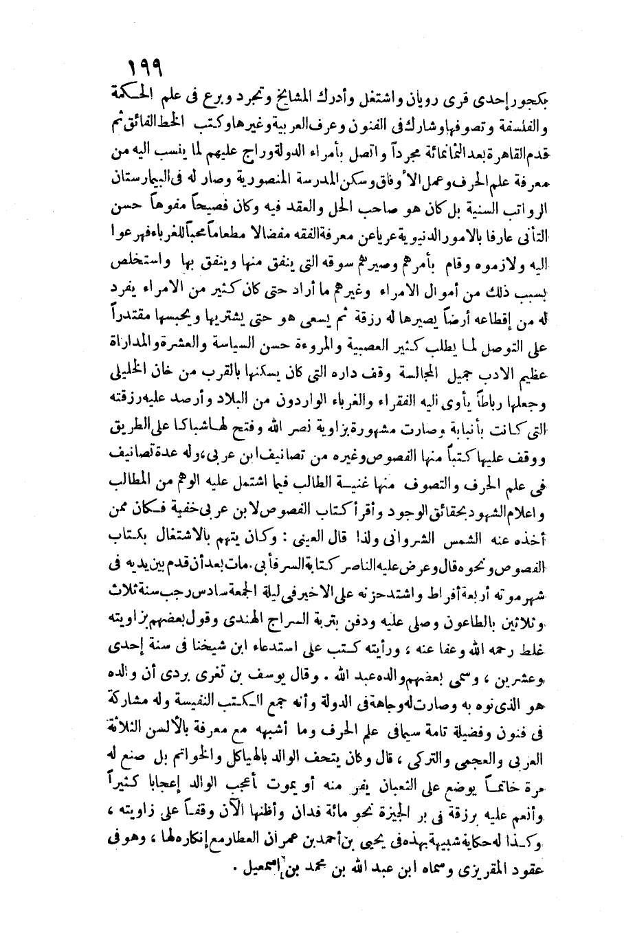 وَالْعقد فِيهِ وَكَانَ فصيحا مفوها حسن التأني عَارِفًا بالأمور الدُّنْيَوِيَّة عريا عَن معرفَة الْفِقْه مفضالا مطعاما محبا للغرباء فهرعوا إِلَيْهِ ولازموه وَقَامَ بأمرهم وصيرهم سوقه الَّتِي ينْفق مِنْهَا وَينْفق بهَا واستخلص بِسَبَب ذَلِك من أَمْوَال الْأُمَرَاء وَغَيرهم مَا أَرَادَ حَتَّى كَانَ كثير من الْأُمَرَاء يفرد لَهُ من إقطاعه أَرضًا يصيرها لَهُ رزقة ثمَّ يسْعَى هُوَ حَتَّى يَشْتَرِيهَا ويحبسها مقتدرا على التَّوَصُّل لما يطْلب كثير العصبية والمروءة حسن السياسة وَالْعشرَة والمداراة عَظِيم الْأَدَب جميل المجالسة وقف دَاره الَّتِي كَانَ يسكنهَا بِالْقربِ من خَان الخليلي وَجعلهَا رِبَاطًا يأوي إِلَيْهِ الْفُقَرَاء والغرباء الواردون من الْبِلَاد وأرصد عَلَيْهِ رزقته الَّتِي كَانَت بأنبابه وَصَارَت مَشْهُورَة بزاوية نصر الله وَفتح لَهَا شباكا على الطَّرِيق فِي علم الْحَرْف والتصوف مِنْهَا غنية الطَّالِب فِيمَا اشْتَمَل عَلَيْهِ الْوَهم من المطالب وإعلام الشُّهُود بحقائق الْوُجُود وأقرأ كتاب الفصوص لِابْنِ عَرَبِيّ خُفْيَة فَكَانَ مِمَّن أَخذه عَنهُ الشَّمْس الشرواني وَلذَا قَالَ الْعَيْنِيّ: وَكَانَ يتهم بالاشتغال بِكِتَاب الفصوص وَنَحْوه قَالَ وَعرض عَلَيْهِ النَّاصِر كِتَابه السِّرّ فَأبى. مَاتَ بعد أَن قدم بَين يَدَيْهِ فِي شهر مَوته أَرْبَعَة أفراط وَاشْتَدَّ حزنه على الْأَخير فِي لَيْلَة الْجُمُعَة سادس رَجَب سنة ثَلَاث وَثَلَاثِينَ بالطاعون وَصلي عَلَيْهِ وَدفن بتربة السراج الْهِنْدِيّ وَقَول بَعضهم بزاويته غلط رَحمَه الله وَعَفا عَنهُ، ورأيته كتب على استدعاء ابْن شَيخنَا فِي سنة إِحْدَى وَعشْرين، وسمى بَعضهم وَالِده عبد الله. وَقَالَ يُوسُف بن تغرى بردى أَن وَالِده هُوَ الَّذِي نوه بِهِ وَصَارَت لَهُ وجاهة فِي الدولة وَأَنه جمع الْكتب النفيسة وَله مُشَاركَة فِي فنون وفضيلة تَامَّة سِيمَا فِي علم الْحَرْف وَمَا أشبهه مَعَ معرفَة بالألسن الثَّلَاثَة الْعَرَبِيّ والعجمي والتركي، قَالَ وَكَانَ يتحف الْوَالِد بالهياكل والخواتم بل صنع لَهُ مرّة خَاتمًا يوضع على الثعبان يفر مِنْهُ أَو يَمُوت أعجب الْوَالِد إعجابا كثيرا وأنعم عَلَيْهِ برزقة فِي بر الجيزة نَحْو مائَة فدان وأظنها الْآن وَقفا على زاويته، وَكَذَا لَهُ حِكَايَة شَبيهَة بِهَذِهِ فِي يحيى بن أَحْمد بن عمرَان الْعَطَّار مَعَ إِنْكَاره لَهَا، وَهُوَ فِي عُقُود المقريزي وَسَماهُ ابْن عبد الله بن مُحَمَّد بن إِسْمَعِيل.