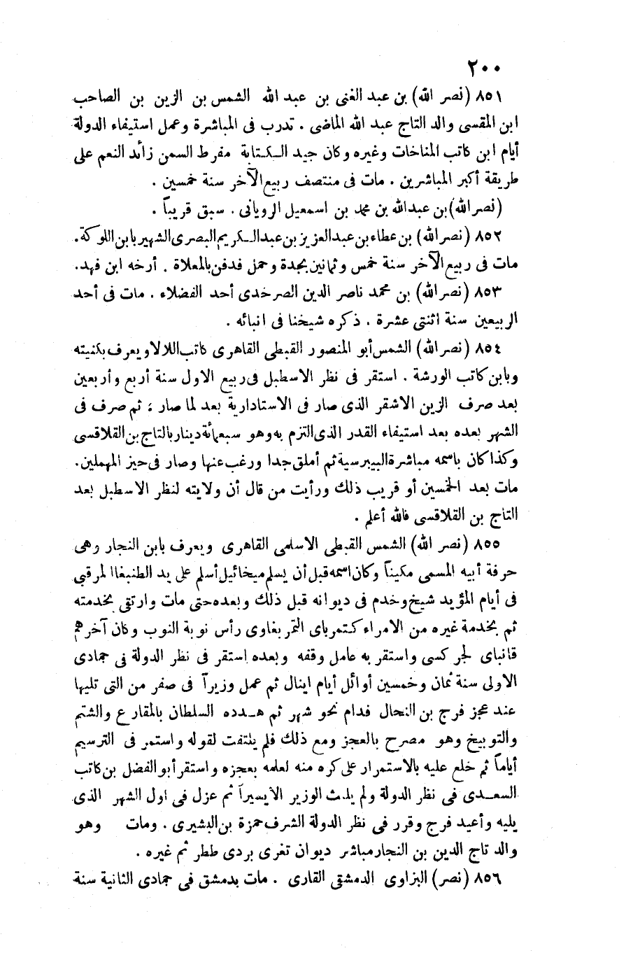 855 - نصر الله الشَّمْس القبطي الْأَسْلَمِيّ القاهري وَيعرف بِابْن النجار / وَهِي حِرْفَة أَبِيه الْمُسَمّى مكينا وَكَانَ اسْمه قبل أَن يسلم ميخائيل أسلم على يَد الطنبغا المرقبي فِي أَيَّام الْمُؤَيد شيخ وخدم فِي ديوانه قبل ذَلِك وَبعده حَتَّى مَاتَ وارتقى بخدمته ثمَّ بِخِدْمَة غَيره من الْأُمَرَاء كتمرباي التمربغاوي رَأس نوبَة النوب وَكَانَ آخِرهم قانباي لجركسي وَاسْتقر بِهِ عَامل وَقفه وَبعده اسْتَقر فِي نظر الدولة فِي جُمَادَى الأولى سنة ثَمَان وَخمسين أَوَائِل أَيَّام إينال ثمَّ عمل وزيرا فِي صفر من الَّتِي تَلِيهَا عِنْد عجز فرج بن النحال فدام نَحْو شهر ثمَّ هدده السُّلْطَان بالماقرع والشتم والتوبيخ وَهُوَ مُصَرح بِالْعَجزِ وَمَعَ ذَلِك فَلم يلْتَفت لقَوْله وَاسْتمرّ فِي الترسيم أَيَّامًا ثمَّ خلع عَلَيْهِ بالاستمرار على كره مِنْهُ لعلمه بعجزه وَاسْتقر أَبُو الْفضل بن كَاتب السَّعْدِيّ فِي نظر الدولة وَلم يلبث الْوَزير إِلَّا يَسِيرا ثمَّ عزل فِي أول الشَّهْر الَّذِي يَلِيهِ وأعيد فرج وَقرر فِي نظر الدولة الشّرف حَمْزَة بن البشيري. وَمَات وَهُوَ وَالِد تَاج الدّين بن النجار مبَاشر ديوَان تغرى بردى ططر ثمَّ غَيره.